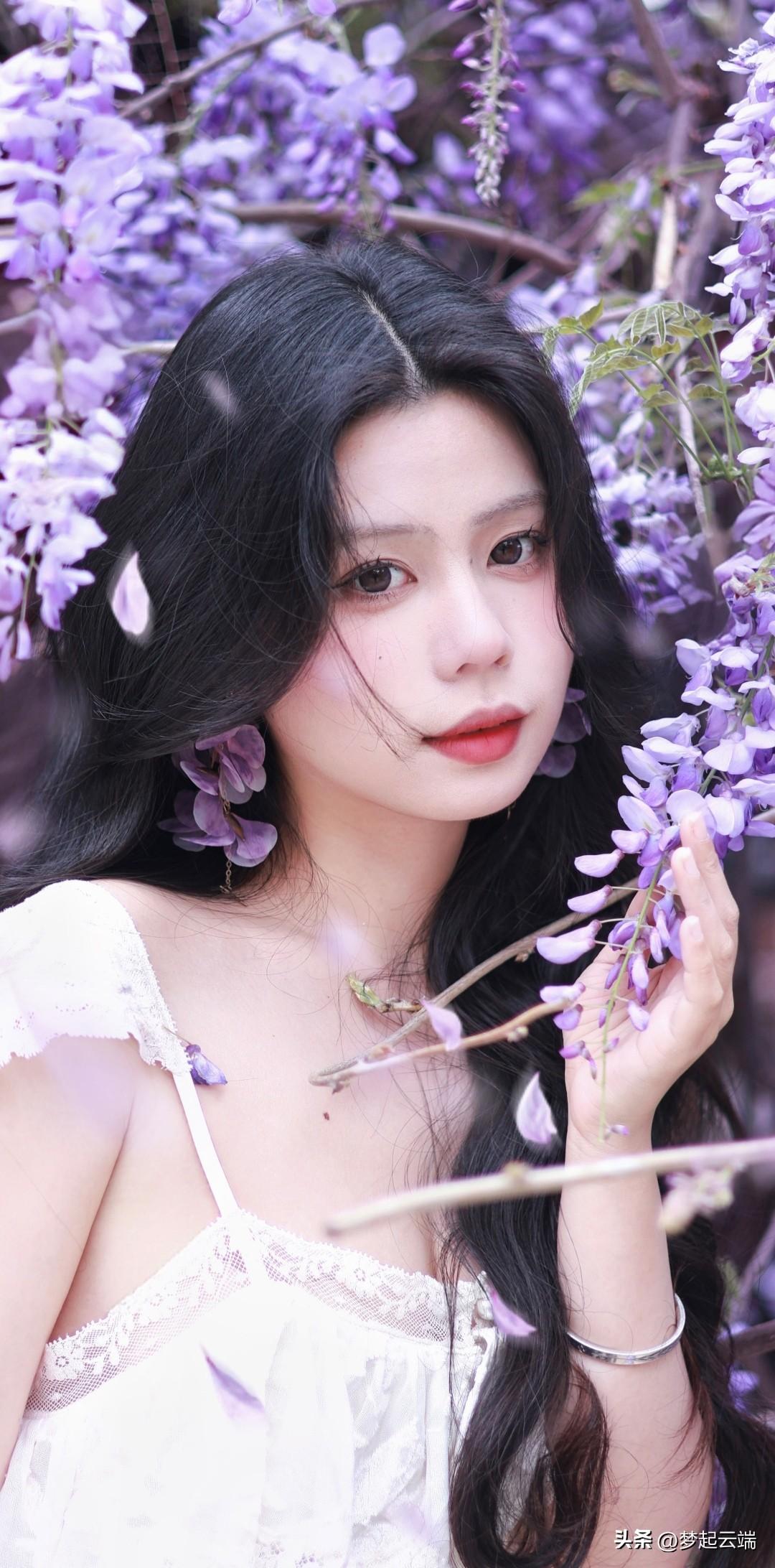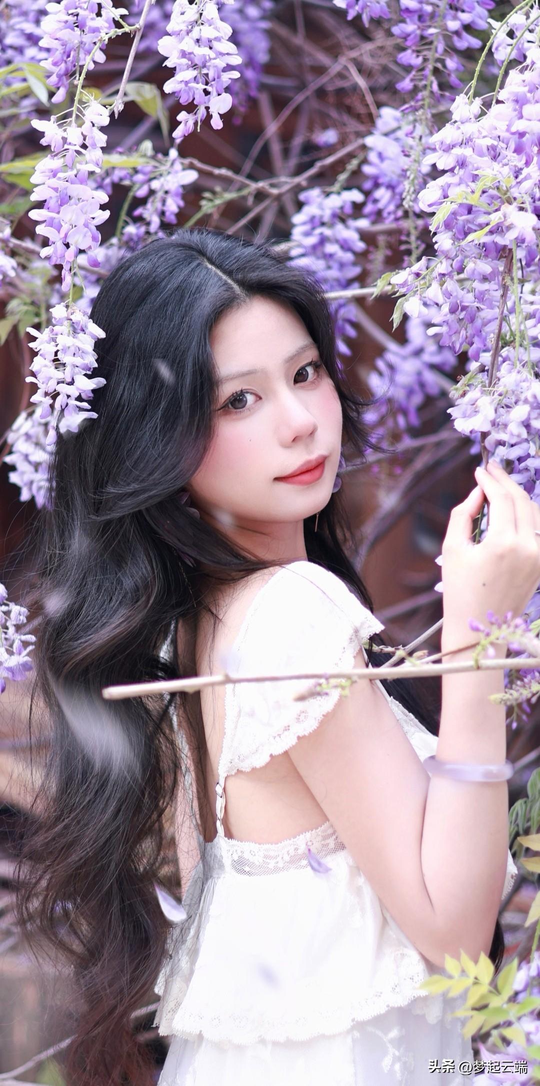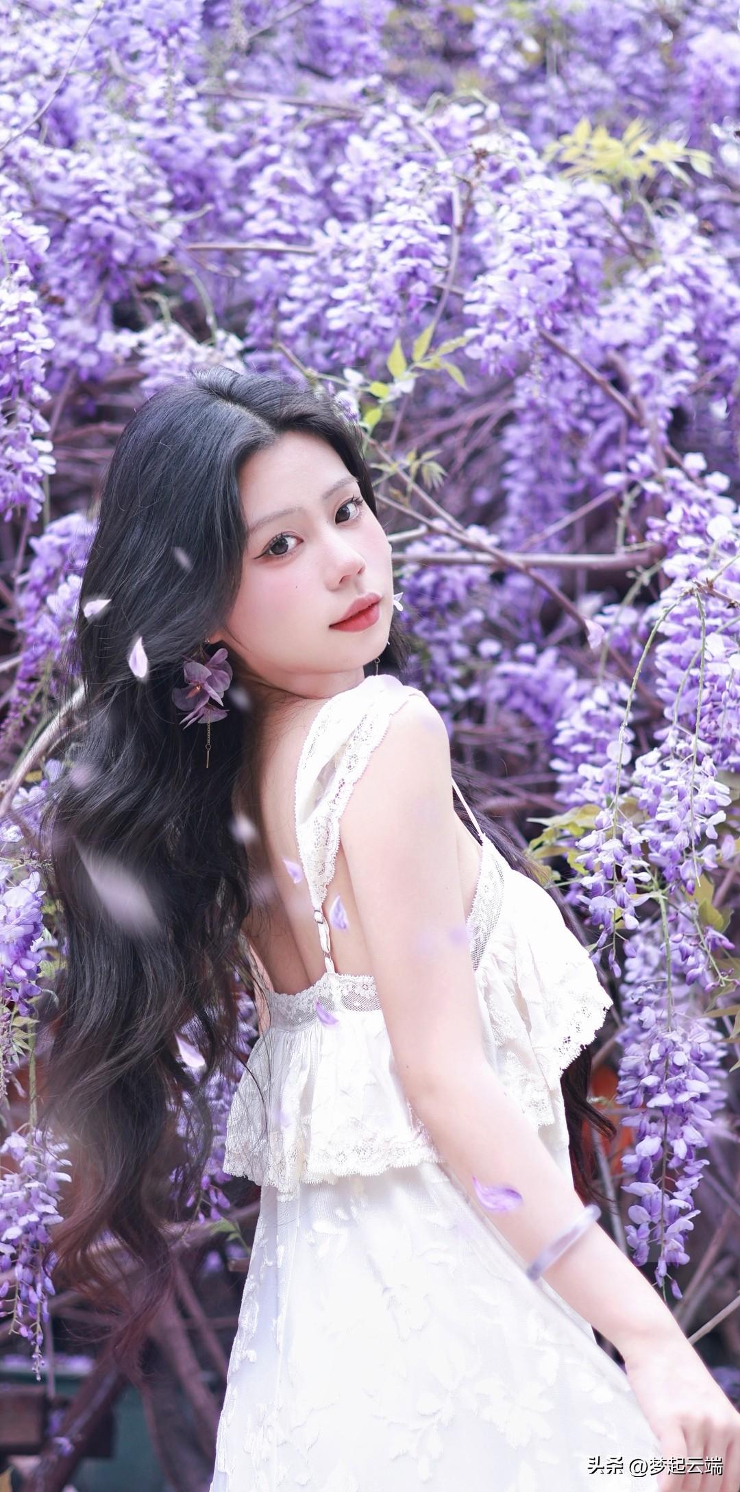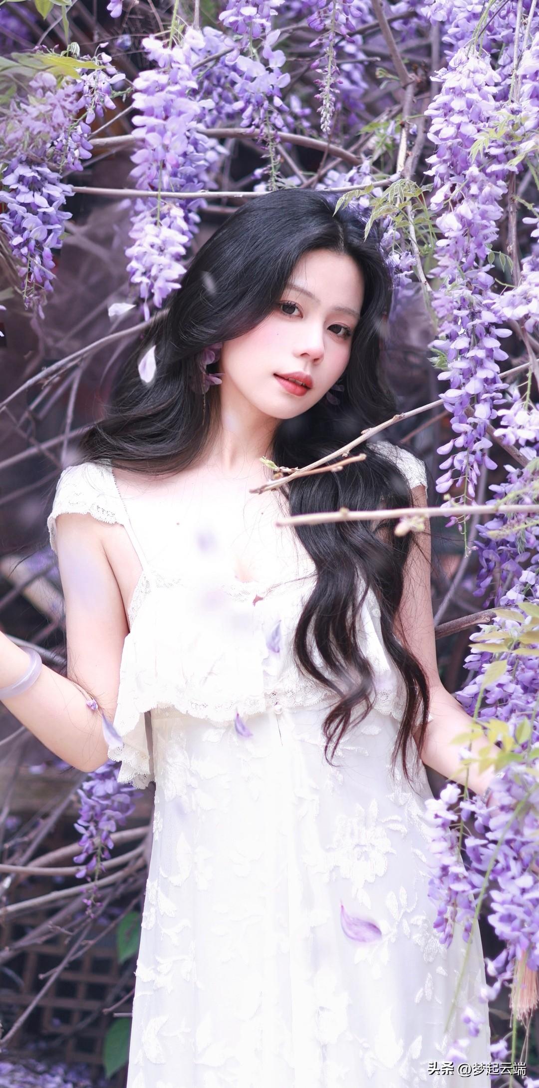梦幻紫色花海中的优雅白裙女子。