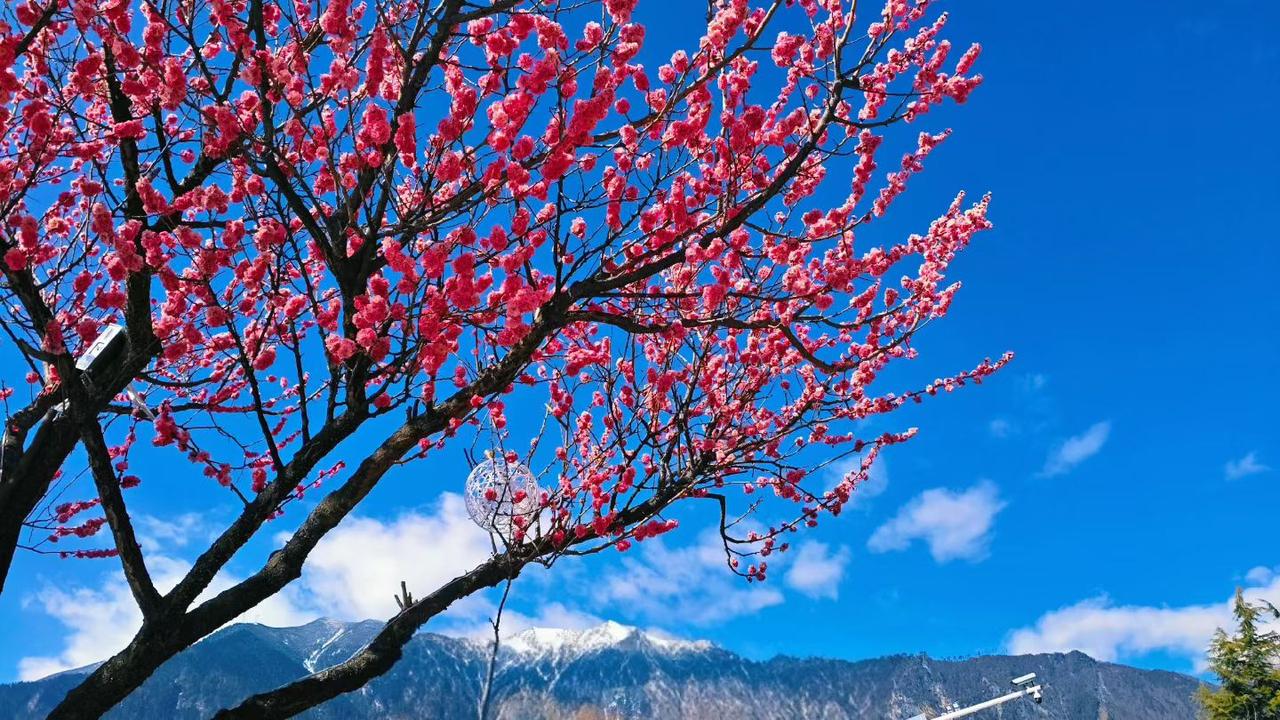 远望雪山依然白,近处桃花已盛开。人还在谈冬日寒,桃花已知春意暖。