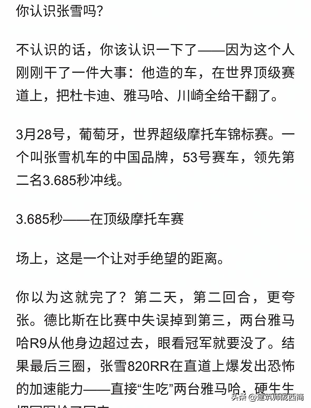 张雪820摩托昨天火了,夺冠时令人绝望的距离,100%纯国产,引擎、电机都是100%国产,这可能从一个侧面说明:中国制造2025已经完全成功了。 更加励志的是张雪这个人,14岁辍学学修理,然后竟然干成了一个世界NO.1,有梦想就去追,诠释的就是张雪这种人吧,不枉人生走一趟。 关键是820摩托价格4.2万,是雅马哈、杜卡迪、川崎的1/5-1/3价格,估计要大卖了。