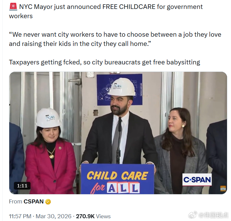 纽约市长刚刚宣布,将为政府工作人员提供免费托儿服务。