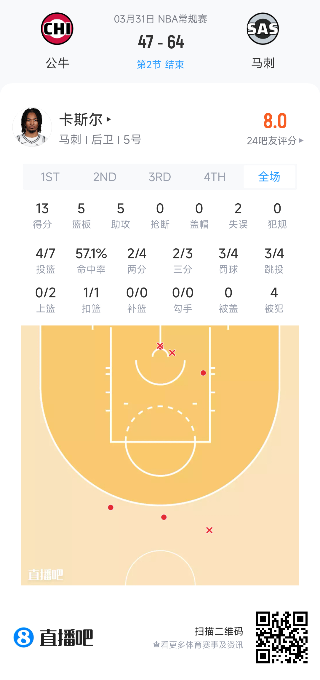 半场马刺64-47公牛!文班亚马21分13篮板2助攻2盖帽!MVP!公牛vs马刺