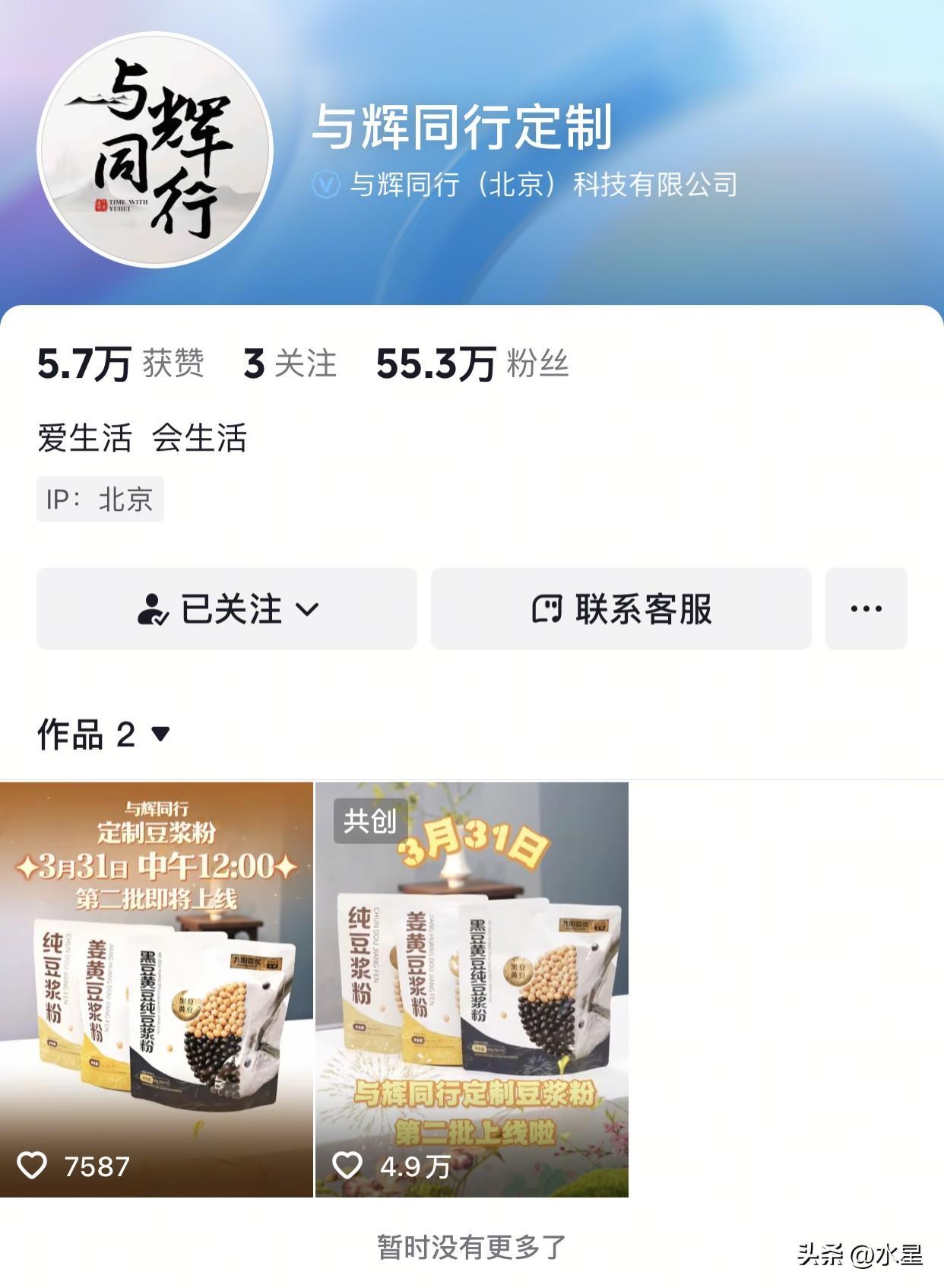 谁家新账号 能做到一天涨粉55万? 董宇辉家的[耶] 而且还不是董宇辉亲自宣传的 “与辉同行定制”这个账号 最先是昨天从潇潇和董董的个人抖音号得知的消息 然后大家口口相传 晚上董宇辉上播时说了说 今天早上一看,账号已经55万粉丝 只发布了2条作品 预告了一下豆浆粉第二批上线时间 31日中午12点 只是不知道 是在这个账号开直播发售 还是在橱窗挂售 今天中午有的忙了[笑哭]