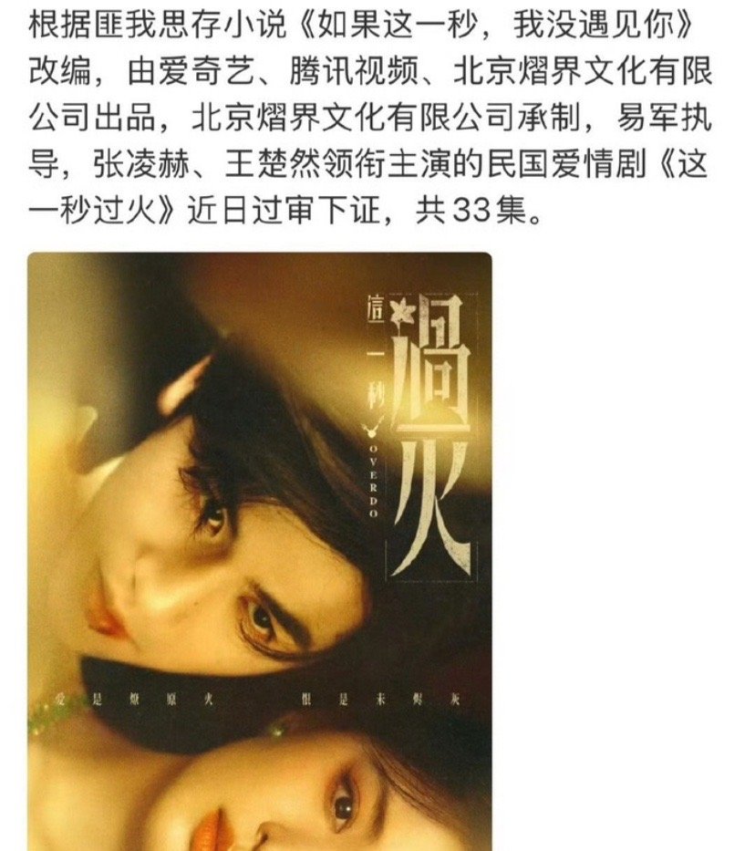 爆光啦!终于等到!张凌赫×王楚然《这一秒过火》正式过审下证,33集全集通关!匪我思存经典虐恋改编,军阀少爷×复仇千金,昔日恋人变叔嫂,禁忌拉扯+强取豪夺+假死复仇,性张力直接拉满!张凌赫军装疯批少帅、王楚然旗袍白切黑,双神颜同框太杀了!爱奇艺+腾讯双平台待播,燥候定档!
