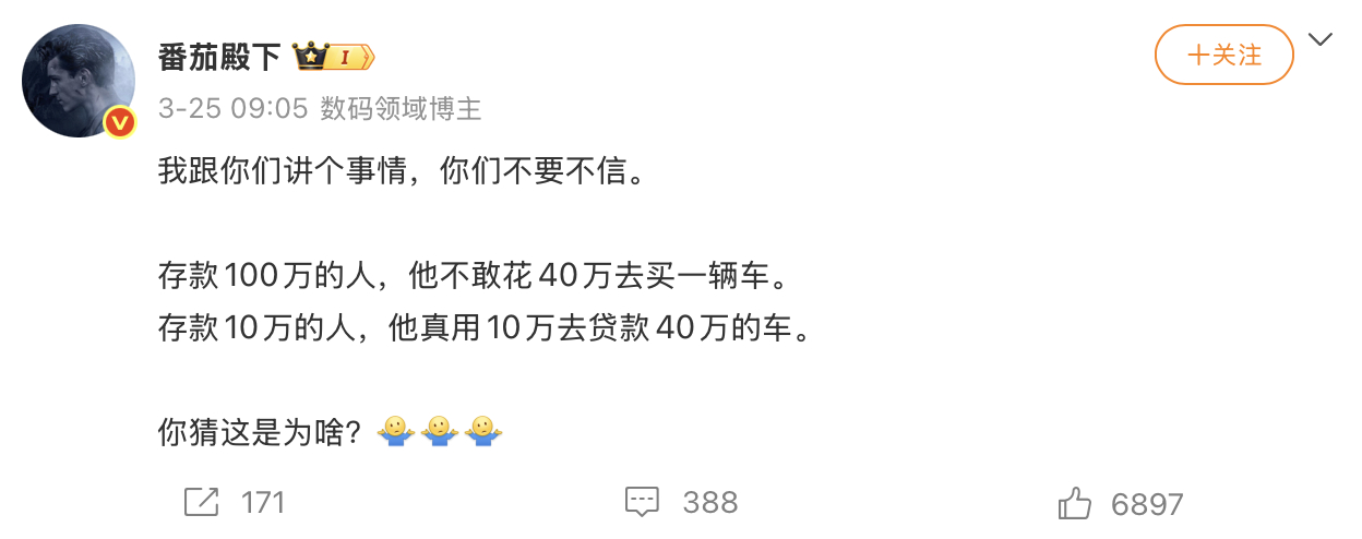 网友说,存款100万的人想的是用这100万赚更多的100万,存款10万的人想用10万的钱去装40万的逼。