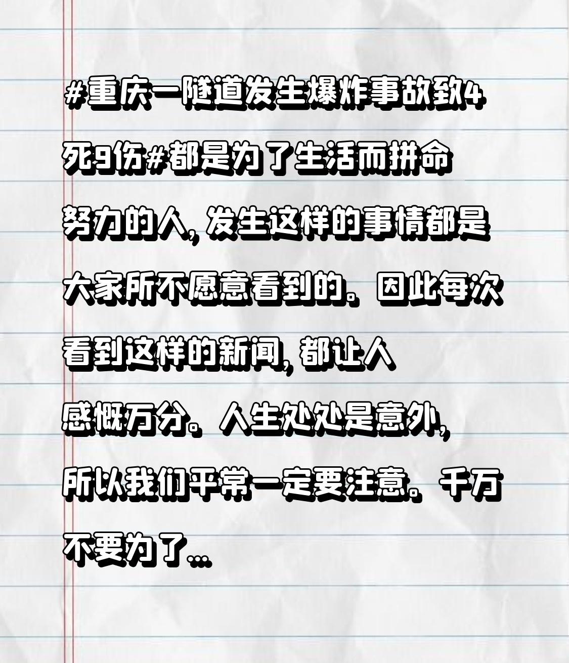 重庆一隧道发生爆炸事故致4死9伤都是为了生活而拼命努力的人,发生这样的事情都是大家所不愿意看到的。因此每次看到这样的新闻,都让人感慨万分。人生处处是意外,所以我们平常一定要注意。千万不要为了赚钱,而忘记了安全的重要性。重庆一隧道发生爆炸致4人死亡