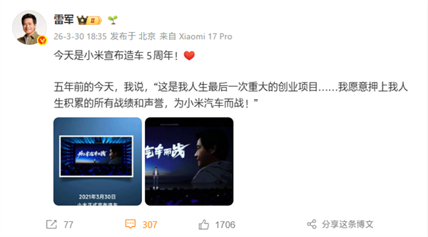 雷军官宣造车五周年(2021.3.30-2026.3.30),小米汽车交出亮眼成