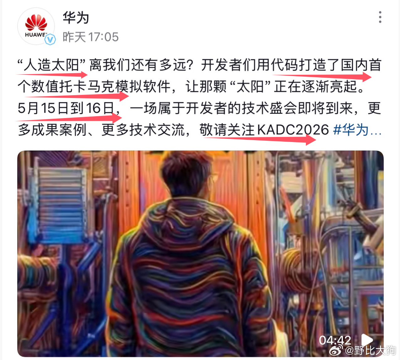 华为官方号昨晚发布重磅视频,暗示要进军可控核聚变,预告5月份可能有核聚变首个托卡马克模拟软件发布,这是华为第一次发布核聚变视频