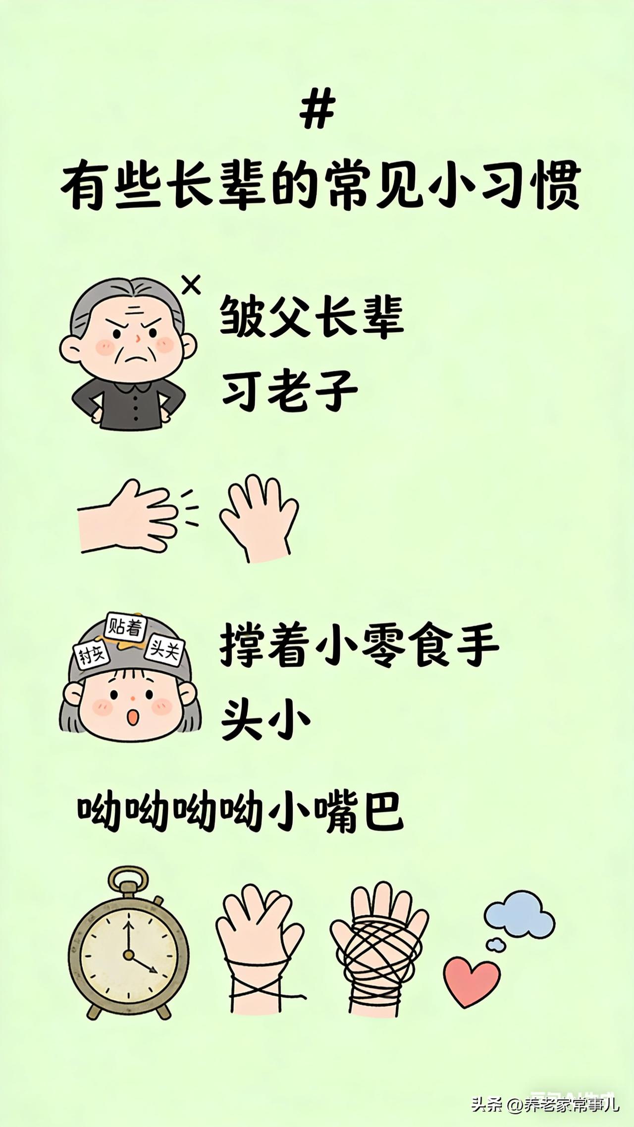 有些长辈的常见小习惯: 1. 总爱拿年纪说事,觉得自己说什么都有理,听不进不同意见。 2. 什么事都想插手,谁家的事都要点评几句,好心办坏事还不自知。 3. 爱占点小便宜,总想着多拿一点、多蹭一点,不吃一点亏。 4. 容易以偏概全,听一句话就下结论,认准的理十头牛都拉不回来。 5. 喜欢议论家长里短,传闲话、猜心思,越传越偏。 6. 习惯用自己的老观念要求别人,不合心意就觉得对方不对。 7. 爱操心过度,明明管不了太多,非要事事都按自己的来。 8. 嘴上说着为你好,实际常常让人觉得压抑又无奈。