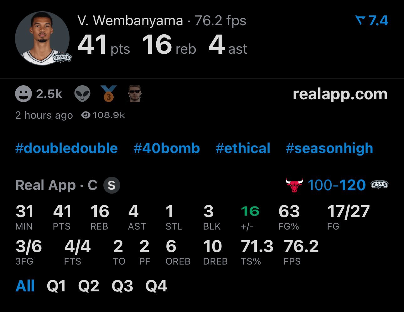 文班亚马31分钟,41分16篮板4助攻3盖帽1抢断!