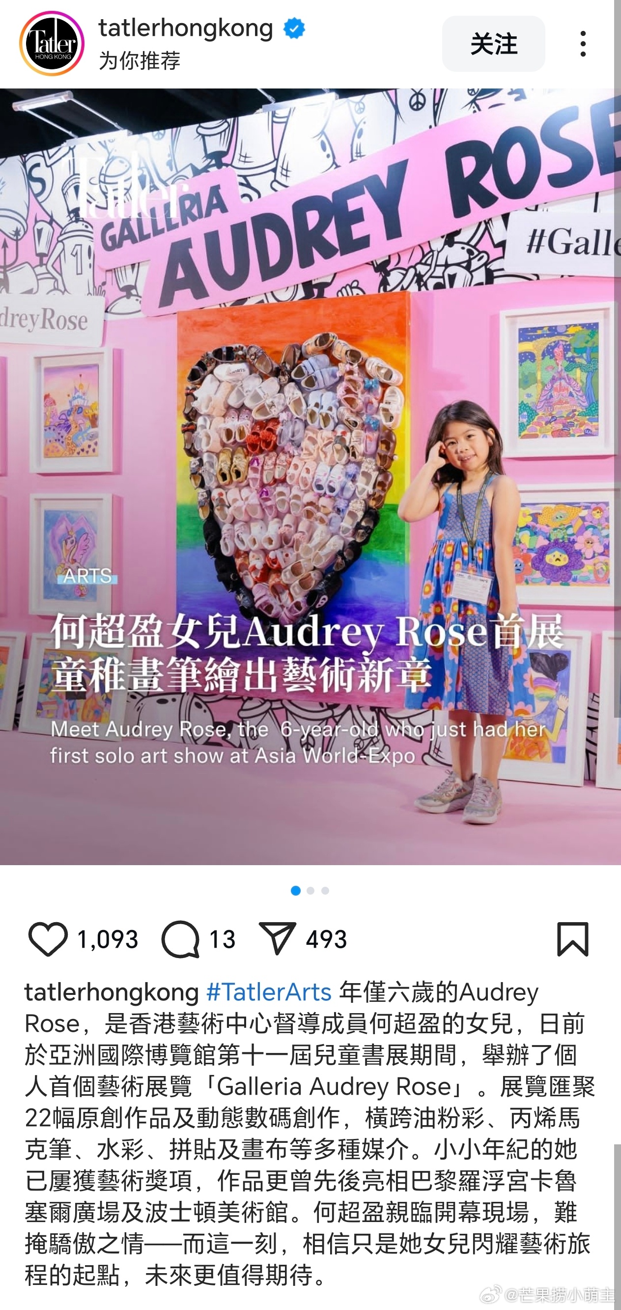 何超盈6岁女儿举办艺术展何超盈为6岁女儿举办艺术展 何超盈6岁女儿辛阡觅近日在“儿童书展”举办个人艺术展览“Galleria Audrey Rose”,并获颁“最佳儿童艺术大奖”,小小年纪已屡获艺术奖项。