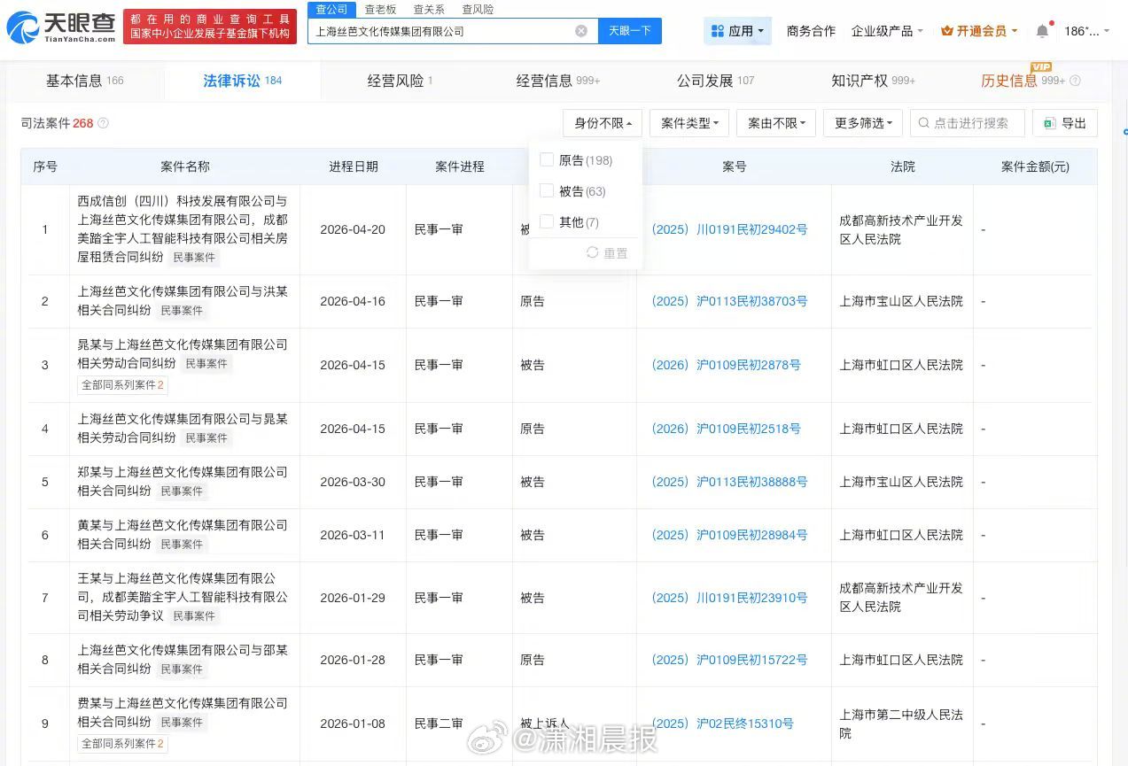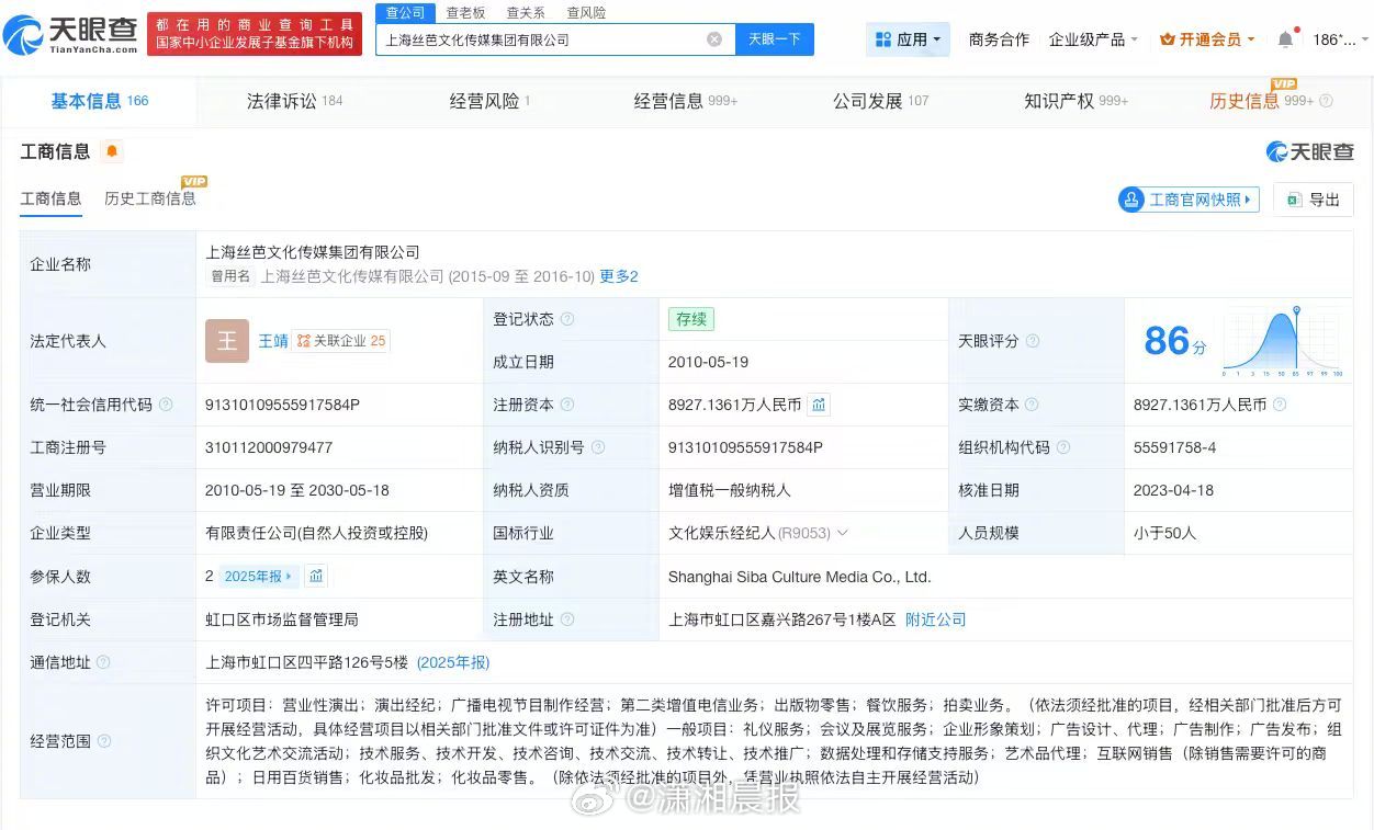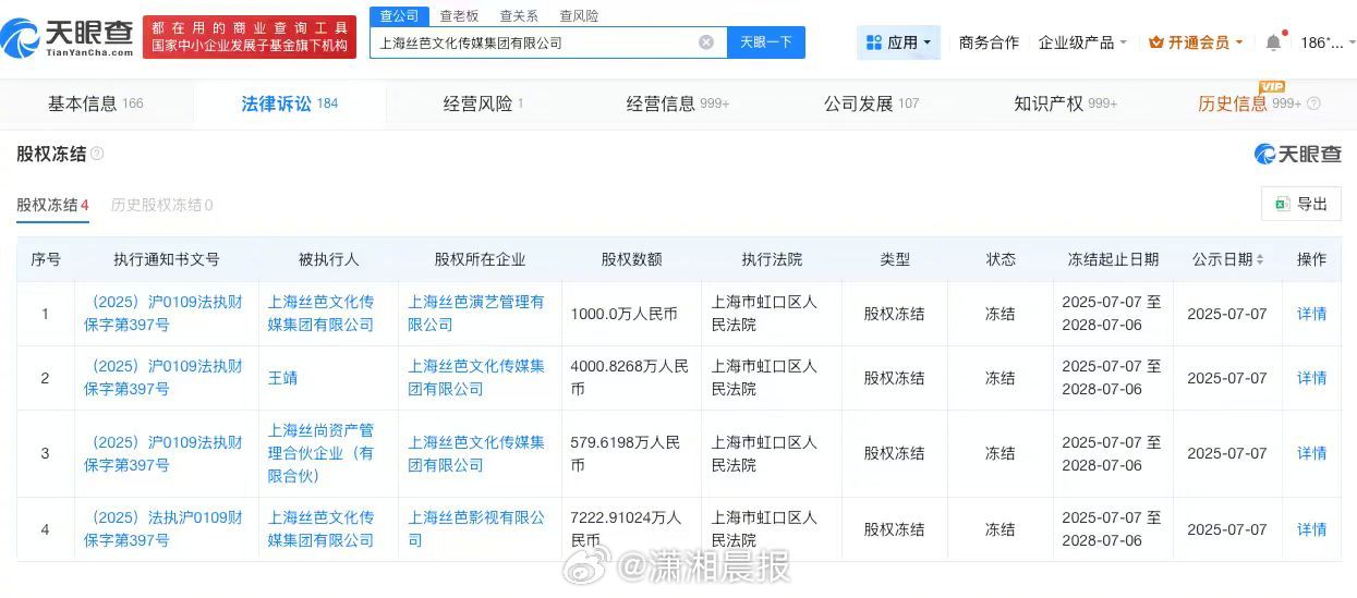 【#丝芭传媒涉及不正当竞争纠纷#,#丝芭传媒近期被罚#】#鞠婧祎 丝芭#据媒体报道,近日,丝芭传媒向国家税务总局上海市税务局稽查局实名举报鞠婧祎涉嫌偷税漏税。记者查询天眼查发现,丝芭传媒关联公司上海丝芭文化传媒集团有限公司成立于2010年5月,法定代表人为王靖,注册资本约8927万人民币,经营范围包括营业性演出、演出经纪、广播电视节目制作经营等。股东信息显示,该公司由王靖、上海星澈创业投资合伙企业(有限合伙)、北京创新方舟科技有限公司等共同持股。法律诉讼信息显示,该公司涉及多起司法案件,案件身份多为原告,案由包括合同纠纷、不正当竞争纠纷、劳动合同纠纷等。行政处罚信息显示,2025年12月,该公司因未经批准擅自从事出版物的出版业务,被上海市虹口区文化和旅游局罚款1万元。此外,上海丝芭文化传媒集团有限公司现存多则股权冻结信息,被执行人包括该公司、王靖等。 鞠婧祎