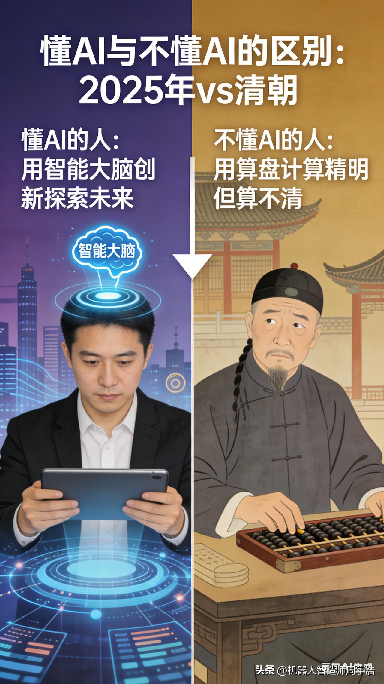 今天的人分两种:懂AI的,和不懂AI的人!今天99.9%人对AI的理解,就和35年前人对互联网的理解一样,根本意识不到互联网会彻底改变人的生活和工作方式,即使今天对AI最乐观的估计,十年后都是最保守的。今天最大的阶层分化不是钱和地位,而是会用AI和不会用AI之间分化,放着这么强大的一个智能大脑都不会用,这是巨大的认知差,将导致社会严重分化。今天懂AI的人与不懂AI的人之间区别,就像2025年的人与清朝人之间的区别,一个用智能大脑去创新今天探索未来,一个用算盘计算一脸精明还什么都算不清。而未来10年后的AI原生态人,他们根本理解不了为什么今天的人开车要用方向盘,为什么每年上百万生命死于车祸,还允许人驾驶汽车?他们认为今天做广告营销卖东西的方式和欺骗没什么区别!AI科技文明带来的道德观已经开始注入到他们的基因,他们看不懂AI的人,就像今天的人看待原始人一样。
