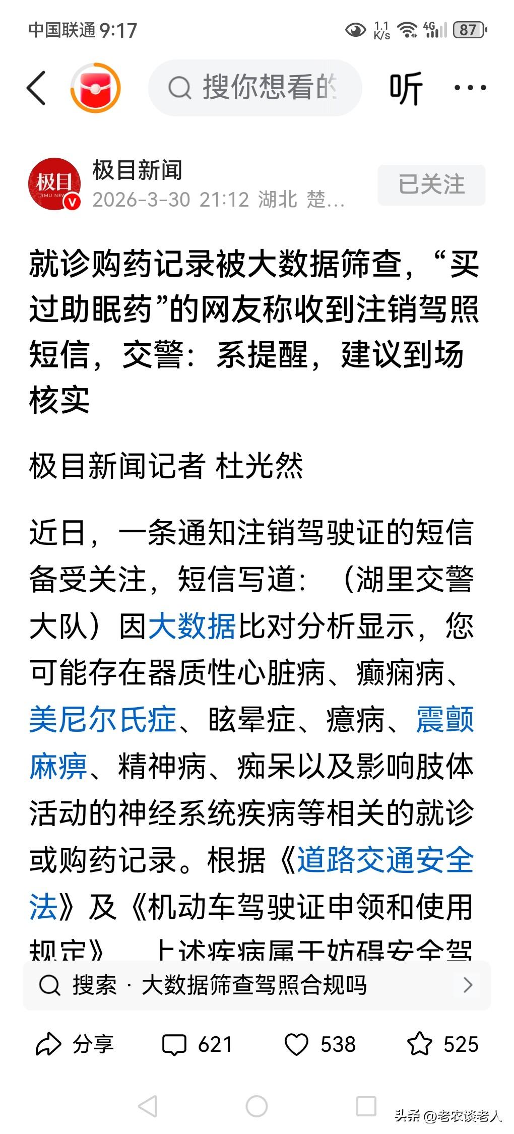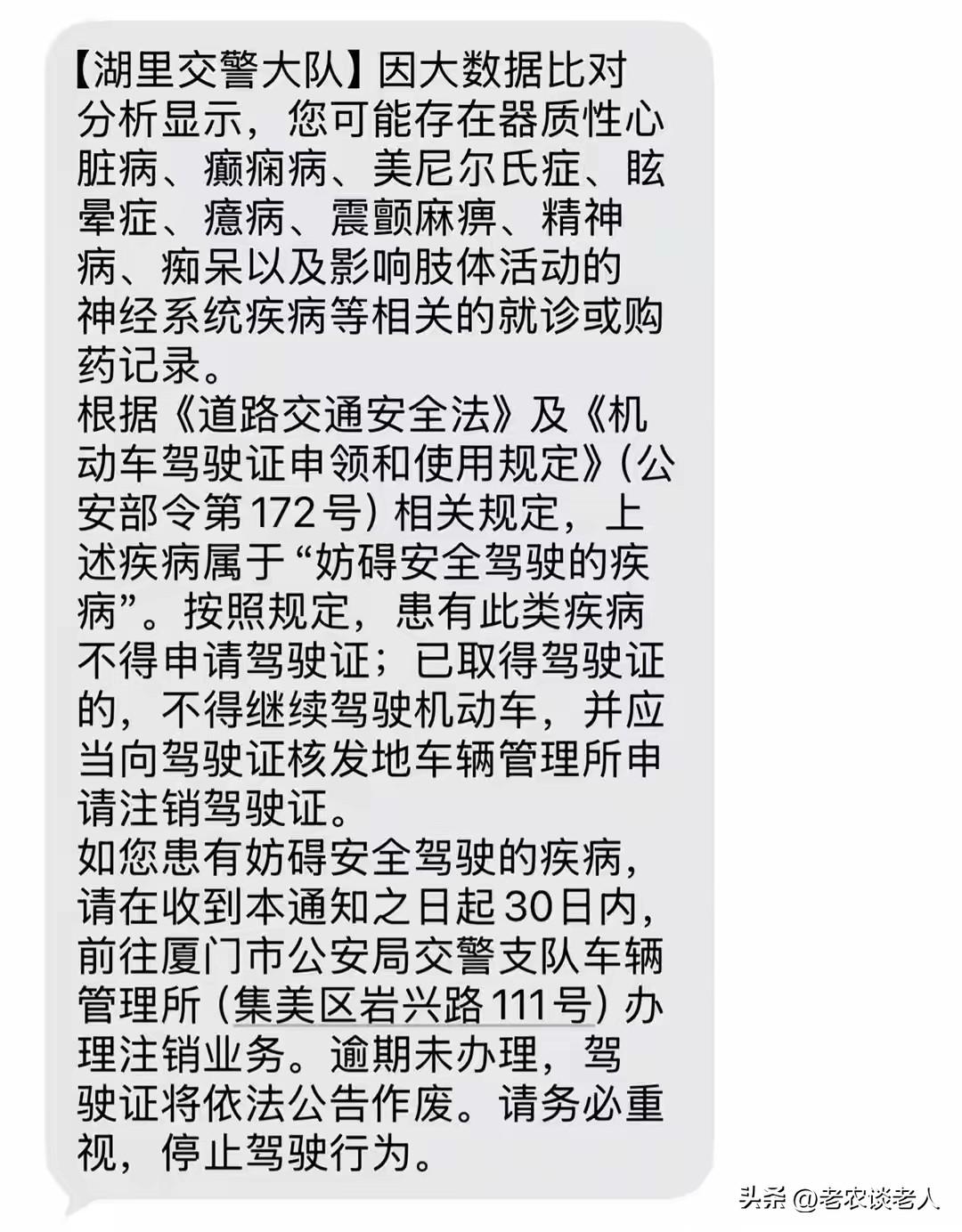 买助眠药收到注销驾照短信,是怎么回事? 失眠症是很多人一种常见的疾病,有很多顽固性失眠症的患者,在不得已的情况下,为了工作、学习和生活好,不得不购买一些镇定药物来缓解失眠症的症状,达到优质睡眠的程度和目的。 随着我国的科学技术的发展,大数据已经应用于各行各业,加上我国的交通事业快速发展,而交通事故发生率又在不断的攀升,因此,交通管理方面不得不采取通过大数据,来管控交通事故发生的一种科学管理的有效方法。所以交通部门通过大数据筛选,发现驾驶员购买和服用促进睡眠的佐匹克隆、速效救心丸、硝酸甘油、硝酸甘油舌下片等药物,可以判断为,该驾驶员已经患上了器质性心脏病、癫痫病、神经病等疾病,是交通事故发生的重要原因。所以交管部门对这些患者就会通过大数据筛选发出,有可能注销驾驶证的通知。 据媒体3月30日报道,有驾驶员在购买促进睡眠的佐匹克隆以后,就收到交管部门通过就诊购药记录被大数据筛查的“买过助眠药”的患者,收到注销驾照短信。交警回应,是交警官方提醒,建议到场核实情况。 根据《道路交通安全法》及《机动车驾驶证申领和使用规定》,有脆弱心源性心脏病、癫痫病和神经病等疾病,属于妨碍安全驾驶的疾病。按照规定,患有此类疾病不得申请驾驶证;已取得驾驶证的,不得继续驾驶机动车,并应当向驾驶证核发地车辆管理所申请注销驾驶证。 通过这则新闻,回到大众的日常生活中来,本人认为,交通管理部门这样做,是依据道路交通管理法规的,是非常正确的,也是非常必要的事情,是替驾驶员身家性命和财产安全负责任的一种做法。 因此,患有这些严重性脆弱性重大疾病的患者,若是开车上路,确实是一件非常危险的事情,必须要慎重起来,千万不要掉以轻心。 当然交通管理方面必须以驾驶员就诊、购买、服用这类疾病的药物的具体情况,来具体评定判断驾驶员是否还能够继续安全驾驶,是关系到驾驶员身家性命的重要保证,是一件大好事。 以上是本人观点,如有不妥,请大家在留言区中留下你宝贵的意见,并积极参与评论。