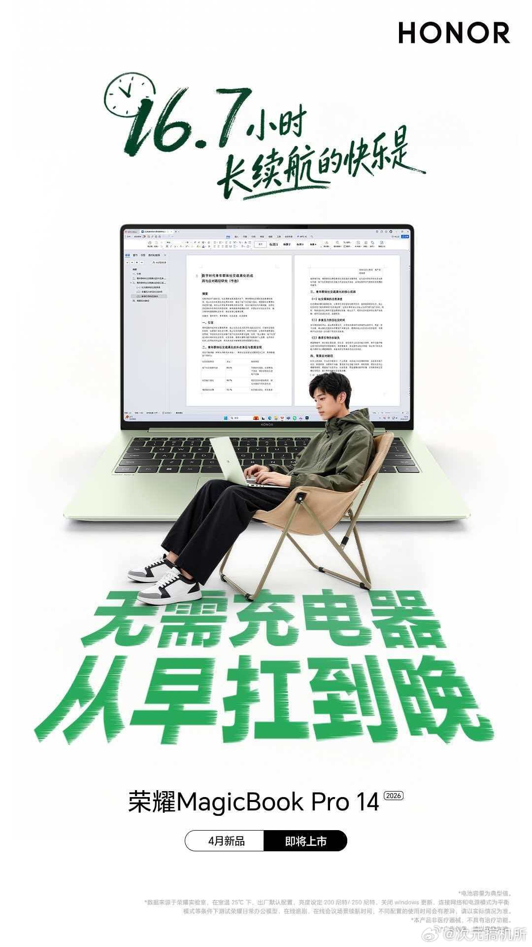 怎么用,都有电!荣耀MagicBookPro14 16.7小时超长续航,快乐直接拉满。游戏局C位,连肝到爽不掉线;一口气刷完30集热播剧,中途不插电;户外学习一整天,无需充电器。大学生的快乐就这么简单!荣耀笔记本 新品4月即将上市,敬请期待!