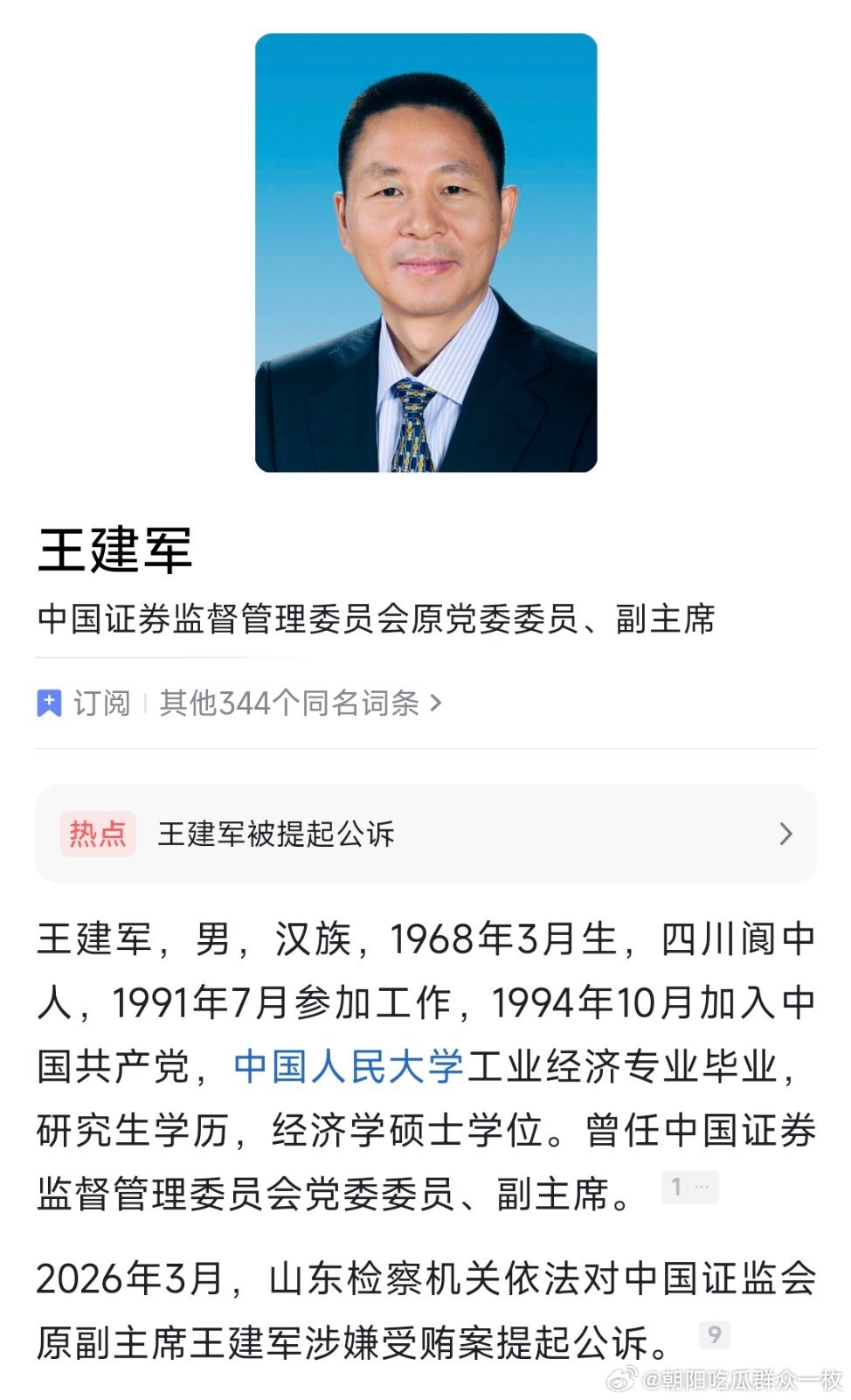 中国证监会原副主席王建军被公诉中国证监会原副主席王建军被提起公诉。