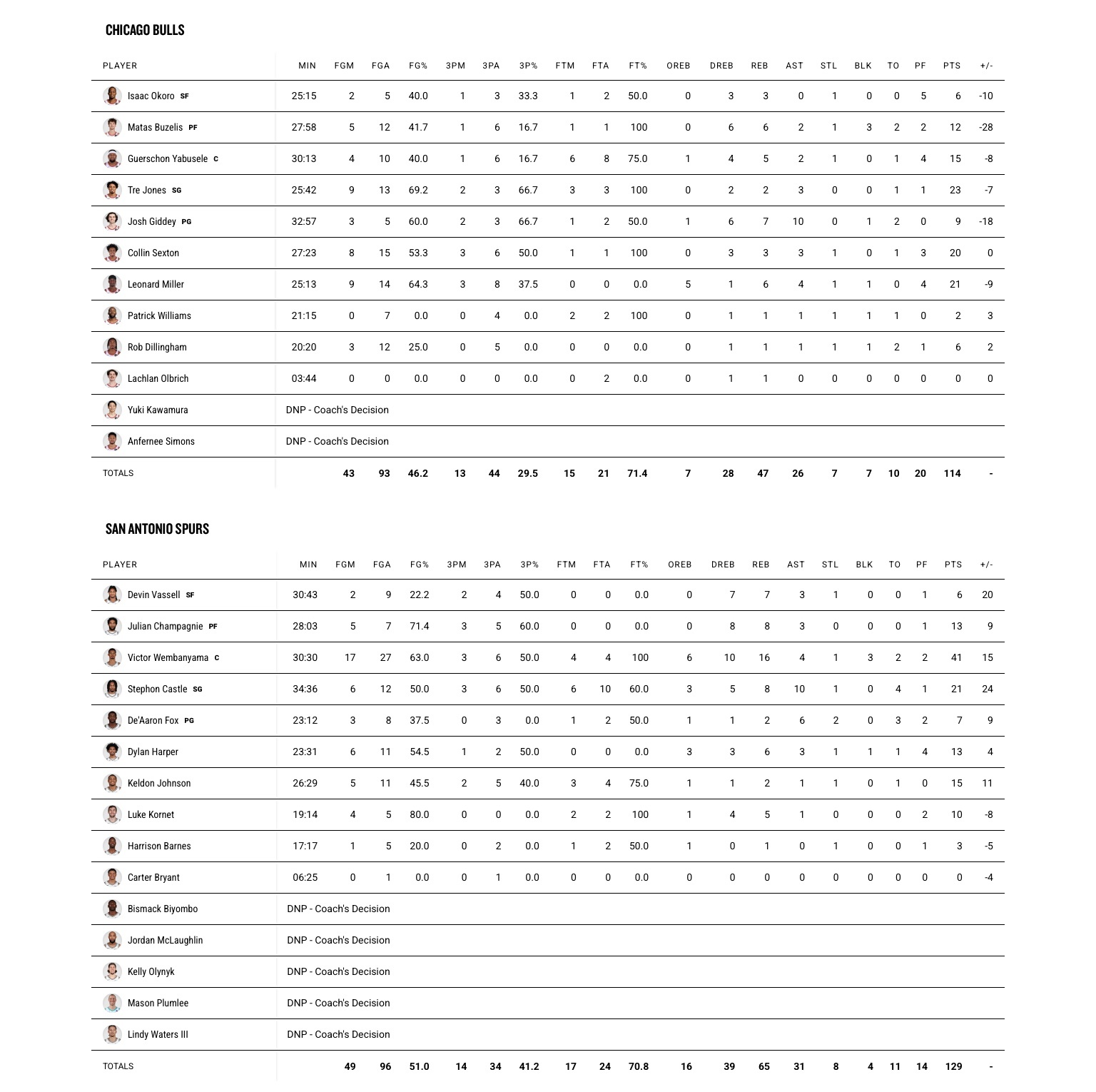 公牛(29-46):特雷·琼斯23分2板3助、米勒21分7板4助、塞克斯顿20分3板3助、亚布塞莱15分5板2助、布泽利斯12分6板2助3帽、吉迪9分6板9助、奥科罗6分3板、迪林厄姆6分1板1助、威廉姆斯2分1板1助、奥尔布里奇1板