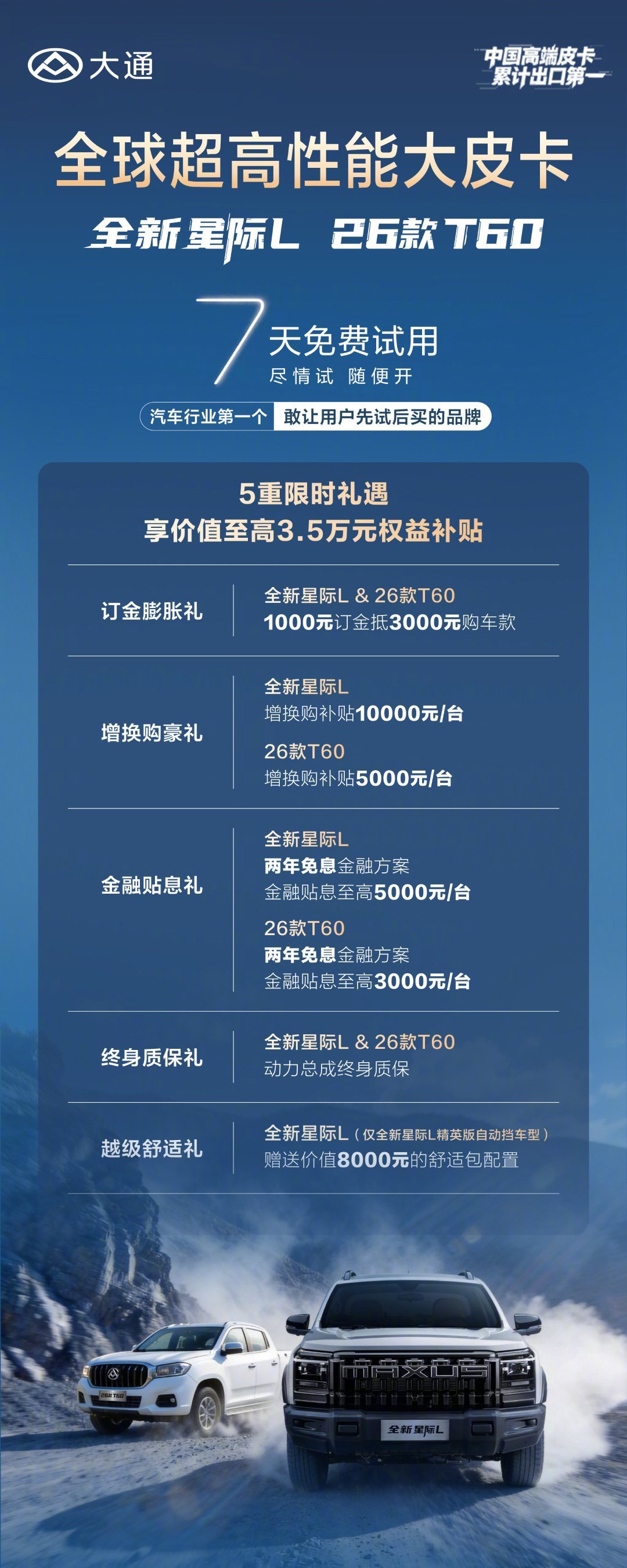 买车先试开爽7天再下单买皮卡最怕盲选?参数再漂亮,不如自己开得踏实。 上汽大通皮卡40万台下线,全新星际L直接给你7天免费深度试用!不是4S店短距离试驾,是真真切切开7天——拉重货、跑烂路、家用、露营、创业拉货,全场景随便造,满意再下单。底气足才敢这么玩。星际L搭载2.5T柴油动力,额定载重超同级一倍,拉3吨也稳;硬派方盒子+酷黑套件+丹霞橙内饰,颜值能打;320万公里耐久测试,极寒、烂路都靠谱。上汽大通国内增速最快,海外高端皮卡销量第一,澳洲五星安全认证,全球标准不双标。买车别听别人说,自己开7天,好不好你说了算。