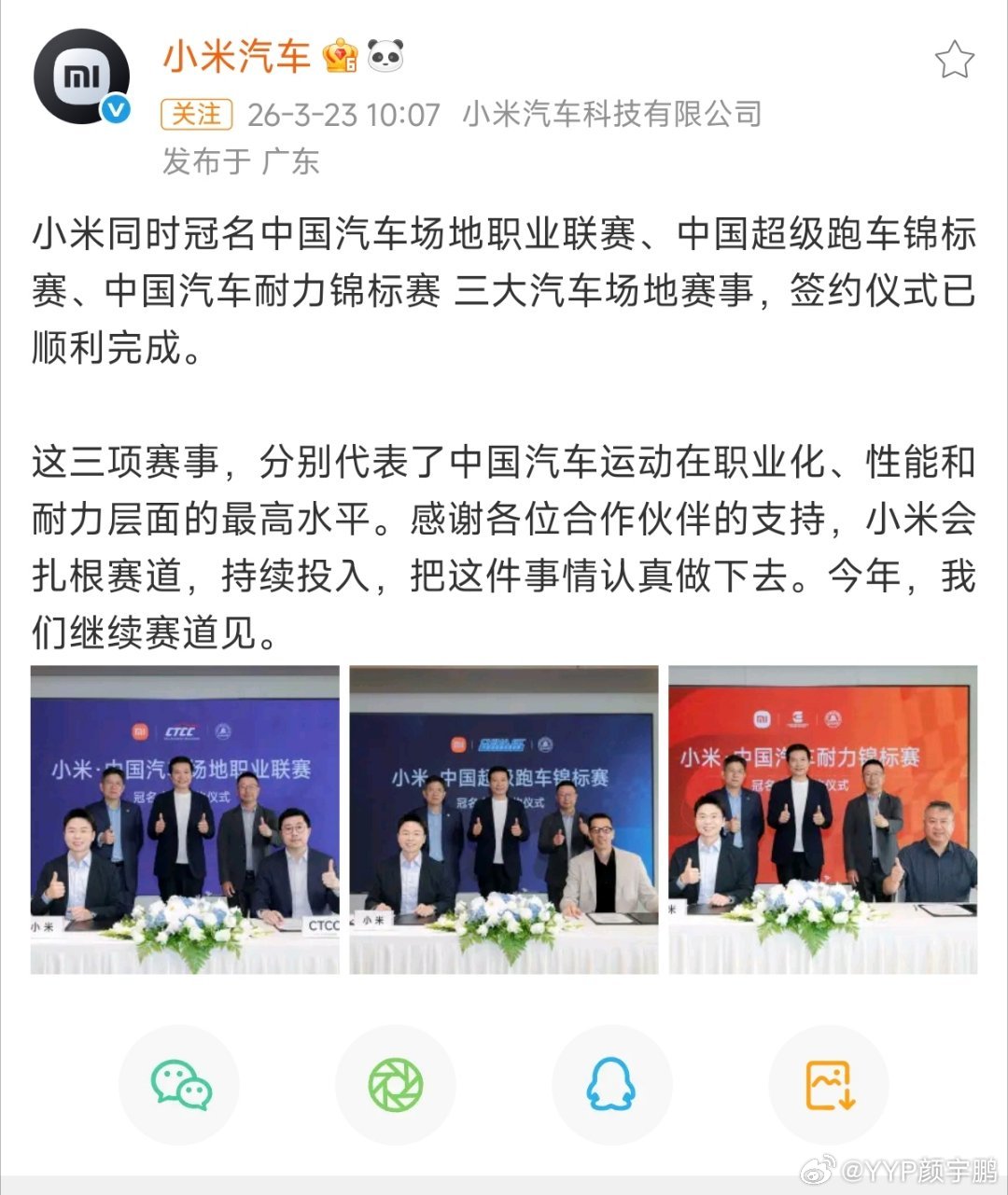 看到一个不太“起眼”的消息——小米同时赞助了中国三大汽车赛事:CTCC、China GT和CEC耐力赛。