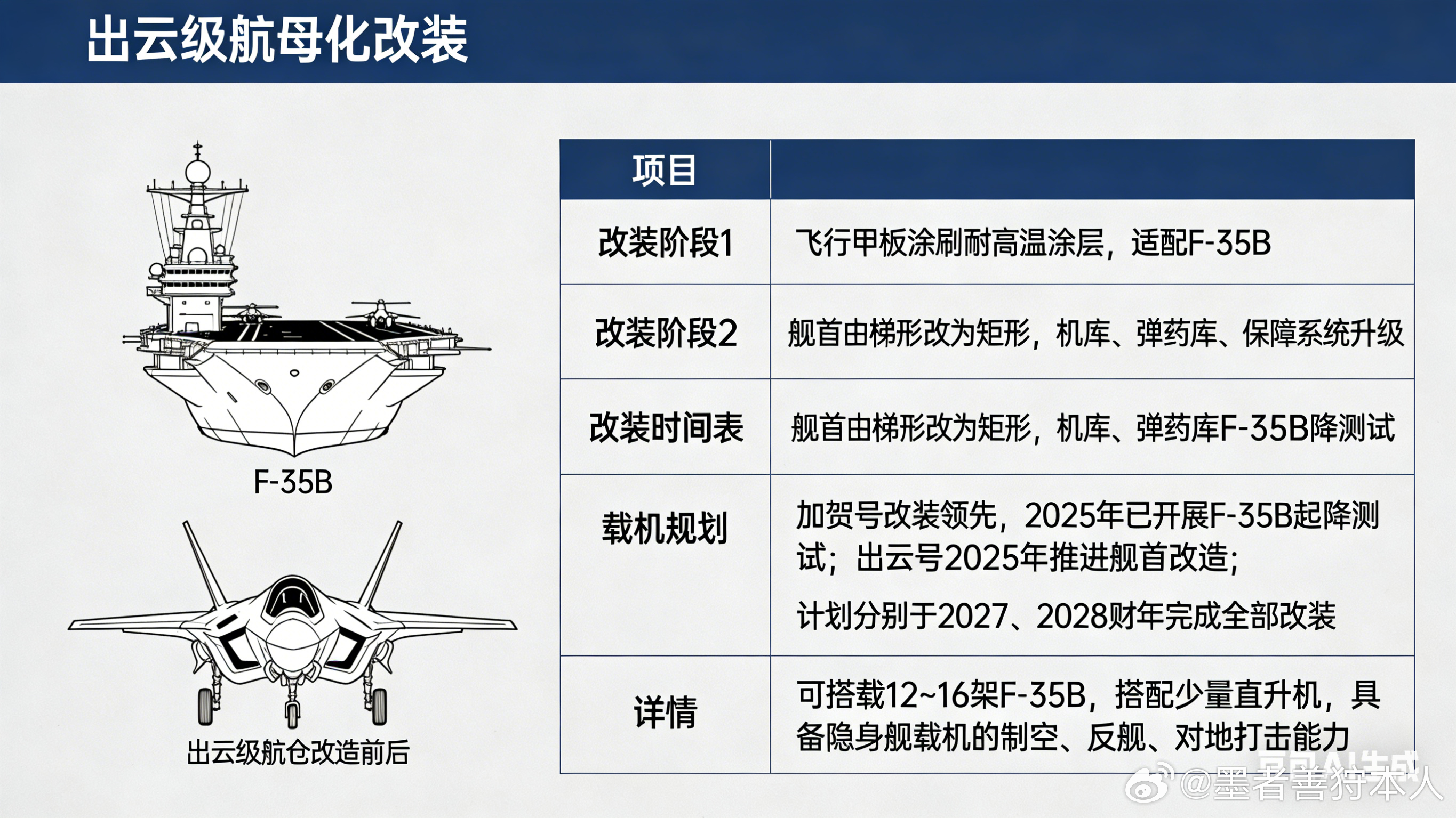 航母化改装关键进展:分两阶段推进,先涂刷耐高温甲板适配F-35B,再改造舰首+升级机库/弹药库;加贺号领先,2025年已开展F-35B起降测试,计划2027财年完成改装,出云号2028财年完工,改装后可载12-16架F-35B。