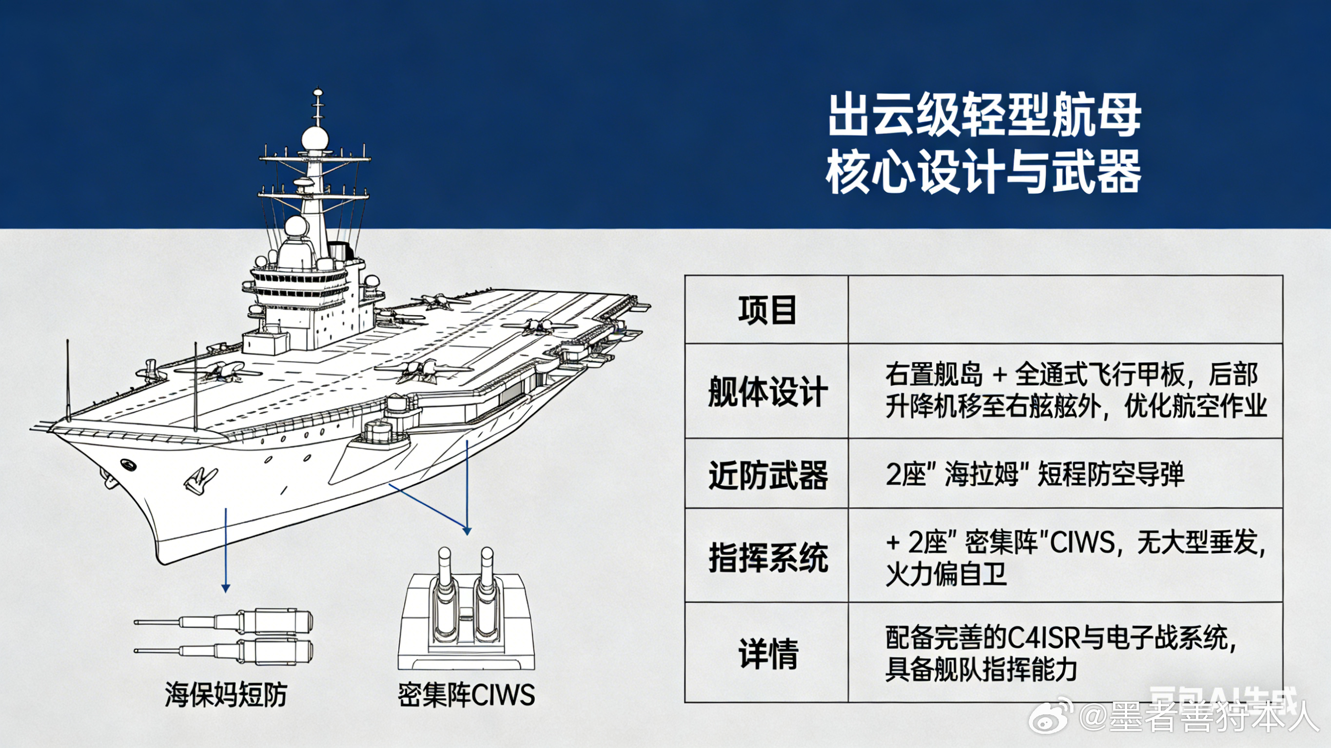 核心设计与武器:采用右置舰岛+全通式飞行甲板,优化航空作业;配备2座“海拉姆”防空导弹+2座“密集阵”CIWS,无大型垂发,火力以自卫为主;搭载完善C4ISR与电子战系统,具备舰队指挥能力。