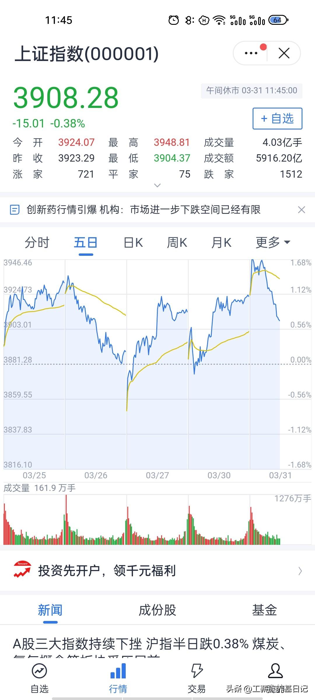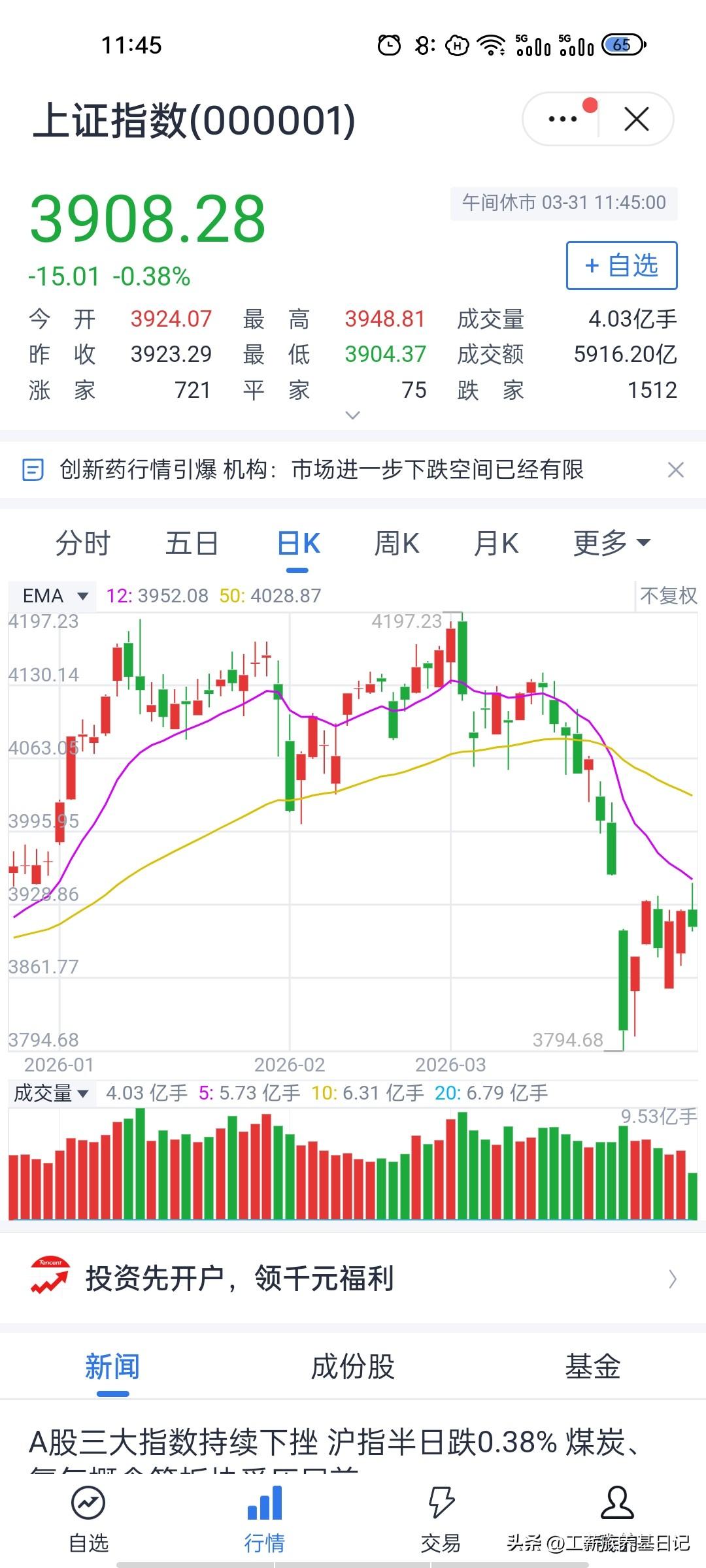 冲高回落翻绿!午盘情绪转弱,3900点面临考验! 我认为今天午盘的走势可以说急转直下,大盘高开冲高后一路回落,最终由涨转跌,截至午间收盘报3908.28点,跌幅0.38%,早盘的反弹势头直接被打断。半日成交额5916亿,相比昨天同期还在温和放量,我觉得这明显是抛压在集中释放,市场情绪也全面转弱,涨跌家数差不多1:2.1,空头明显占据了上风。同时指数也跌破了昨日收盘价3923点,在我看来,短期的反弹趋势已经被破坏,又重新回到3900点附近开始磨底。 我觉得这一波走势就是典型的利好兑现加上获利回吐,早盘冲高更多是情绪惯性,后面的回落才是资金真实的出逃动作。分时图走出了很明显的冲高回落倒V形态,我认为这也说明3948点上方的压力非常强,资金根本不愿意追高接力。而且日线级别指数依然在EMA12均线下方,在我看来,中期空头趋势并没有改变,之前的反弹仅仅只是阶段性修复而已。 我个人预判,下午大盘大概率还是震荡偏弱运行,如果量能维持在9000亿左右,收盘跌幅可能在-0.3%到-0.6%之间;要是午后恐慌盘继续涌出,不排除下探3890-3900点支撑;即使有资金抄底,大概率也只是收出小阴线或者十字星。 在我看来,早盘那波冲高其实并没有持续性,资金兑现后反弹也就暂时歇菜了,不过也不用过度恐慌,现在只是回踩确认支撑,3900点依然是重要底线,大概率不会出现暴跌。我觉得这个位置割肉很容易卖在低点,不妨耐心等下午或者明天看看有没有修复机会。 你们觉得呢?以上纯属个人愚见,欢迎探讨。