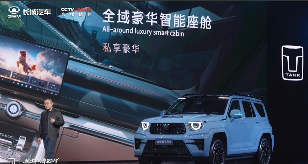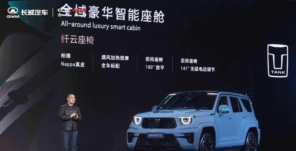 刚预售的坦克700真的顶!麒麟原创设计,瑞麟之眼激光大灯还带机械旋转开合,260米超远照射,鳞甲中网气场直接拉满。 车长超5米,22寸轮毂,坐姿离地一米多,气势一点也不输大G。激光雷达加27个传感器,Coffee Pilot 4.0全场景NOA、代客泊车全都有,语音就能控制加减速变道。 Nappa真皮千云座椅能放平成床,后排大屏、21扬声器杜比音响、5.4升冷暖冰箱配齐,豪华越野一步到位,这才是硬派越野该有的样子。