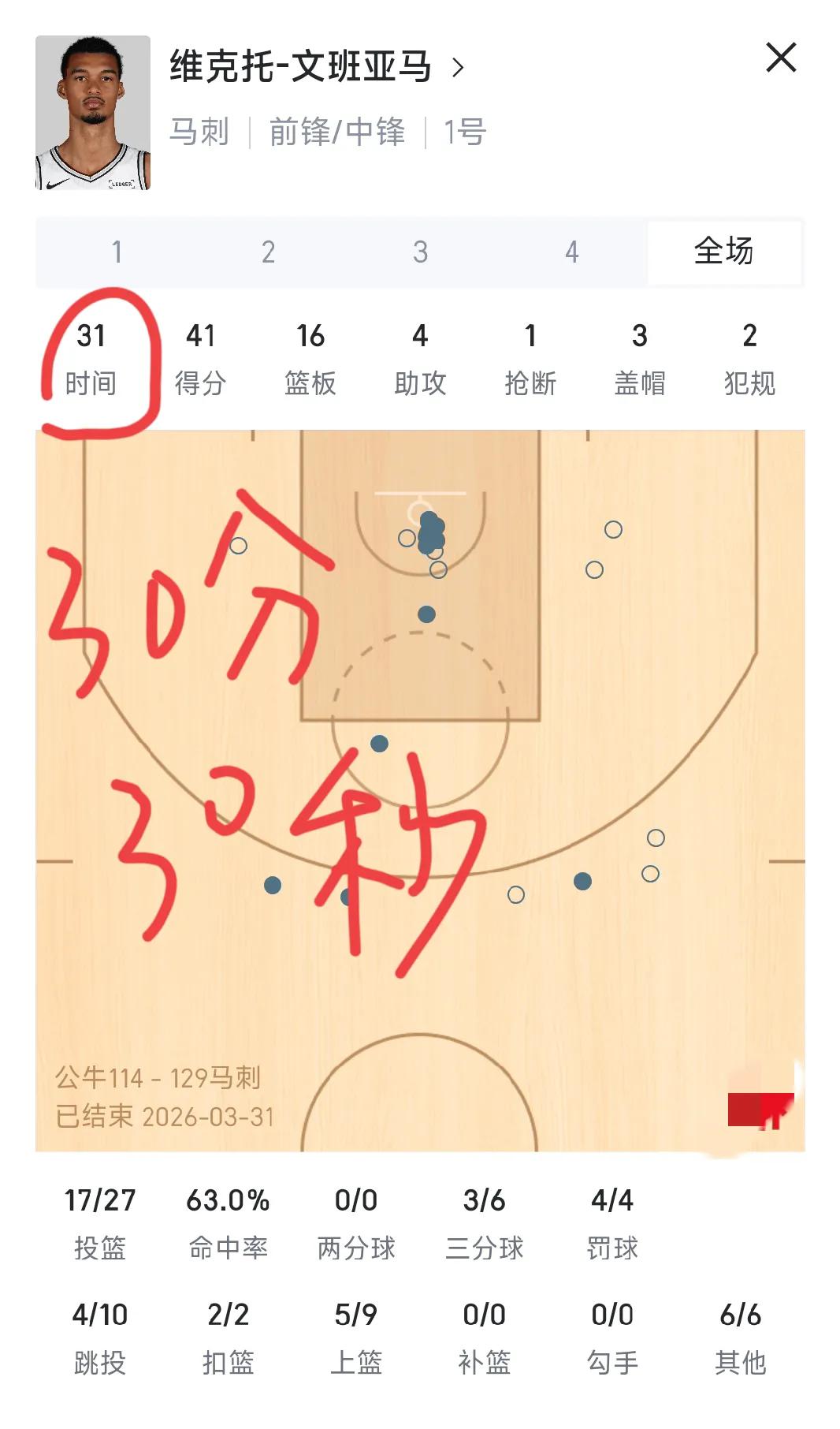 对上了!文班今天出场30分钟30秒,只有4次罚球的情况下拿下41分,就问你雷霆记者,你接下来要如何应对?文班的效率高的可怕,今天得到41分创赛季新高,而且只用了8分钟就得到2双的数据,历史最快。 这也是文班亚马的赛季第三场40+,前两场分别是打独行侠29分41秒拿40分,打湖人26分钟拿40分。今天30分30秒!