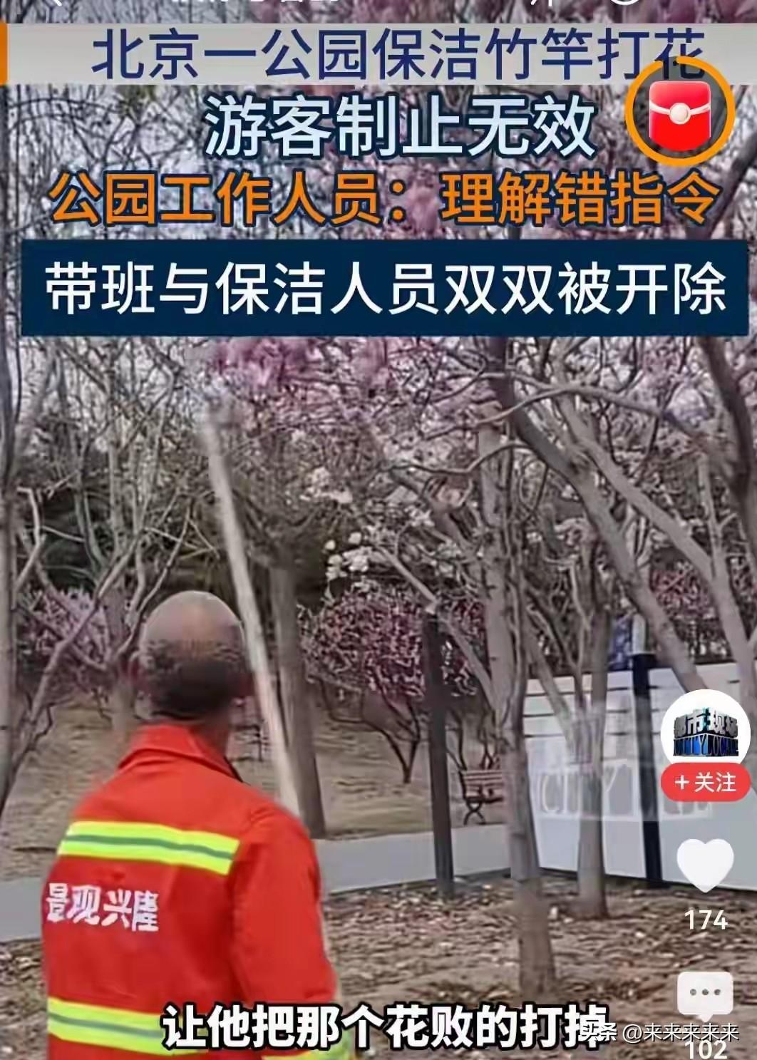北京公园打花事件后续:保洁老人被开除,甩锅式处理难平众怒 3月29日,北京兴隆郊野公园内,一段保洁人员持竹竿打落盛开花朵的视频,引发公众关注。视频里,满头白发的保洁人员一次次挥杆,满树繁花簌簌坠落,散落一地。有游客上前制止,提醒对方这些花是供人观赏的,涉事人员并未停手,依旧继续挥打。 事件发酵后,园区很快给出回应:原本安排的工作是清理树上的残花,方便后续养护,涉事人员错误理解指令,将盛放的鲜花一并打落。目前,涉事的保洁人员与带班人员均已被开除。 这个处理结果,看似快速回应了公众的不满,实则把核心的责任问题轻轻带过,难以平息公众的质疑。 首先,“错误理解指令”的说法,本身就经不起推敲。残花与盛放的鲜花,形态、状态差异一目了然,即便是年龄偏大的保洁人员,也不至于分不清二者的区别。如果一条简单的养护指令,最终被执行成完全相反的操作,首先要追问的,是指令的下达者有没有明确说清作业标准,日常管理中有没有建立规范的操作流程,岗前有没有给到对应的培训与指引。出了问题便将所有过错推给执行的员工,不过是最省事的甩锅话术。 不少网友的评论,都点到了这件事里最让人唏嘘的部分。涉事的保洁人员,多是上了年纪的基层劳动者,一份保洁的工作,对他们而言是维持生计的依靠。在日常的工作链条里,他们处于最末端的位置,大多只能服从上级的安排,很少有质疑指令、拒绝执行的余地。如今出了问题,管理层一句“理解错了”,就把责任全推到了他们身上,直接开除了事。这样的处理,没有触及问题的根源,只是找了替罪羊,给公众一个看似有交代的结果。 这件事的核心,并非某一个保洁人员的行为不当,而是公园管理方的理念出了偏差。公园作为城市的公共空间,存在的意义是给市民提供赏景、休闲的去处,盛放的鲜花,正是公园最核心的价值之一。园区的养护工作,本该是为了维护这份美景,更好地服务市民的需求,可如今却变成了为了养护方便,不惜破坏正在盛放的景观。本末倒置的管理逻辑,才是这件事发生的根源。 类似的情况,其实并不少见。有的地方为了市容整洁,砍掉街边生长多年的老树;有的景区为了管理方便,把市民可亲近的草坪用围栏层层围起;有的养护工作,打着规范的旗号,却做着损害公共利益的事。这些操作的共同点,都是把管理的便利,放在了公众的需求前面。 一句“理解错了”,一次开除处理,堵不上管理上的漏洞,也换不回公众的信任。公众想要的,并非惩罚几个底层员工,而是管理方能真正承担起自己的责任,查清指令下达的全流程,补上管理上的缺口,把服务市民的初衷,放回养护工作的第一位。只有这样,才能避免类似的事情再次发生。