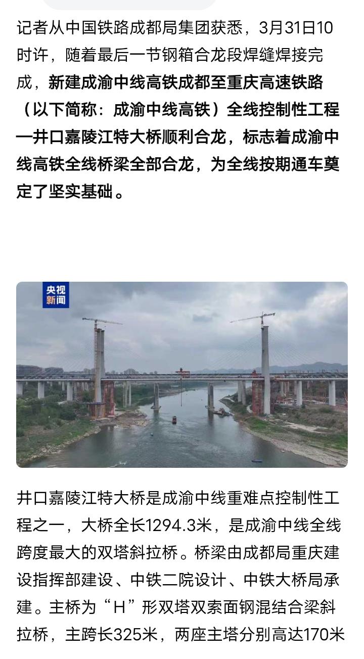 重要进展,成都途经铜梁至重庆时速350公里(预留400)的成渝中线高铁控制性工程全长约1.3公里的井口嘉陵江特大桥已于今天(3月31日)成功合龙,资阳乐至和安岳还有铜梁站主体结构均已完成,即将全面进入内外装修阶段,安岳站已经率先挂牌,预计2027年内可以如期建成开通运营,届时从成都北(建设中)可以实现50分钟直达重庆北,沿途的乐至和安岳还有铜梁将结束不通铁路的历史,成渝中线高铁全线已进入无砟轨道和四电工程施工阶段,联调联试指日可待。