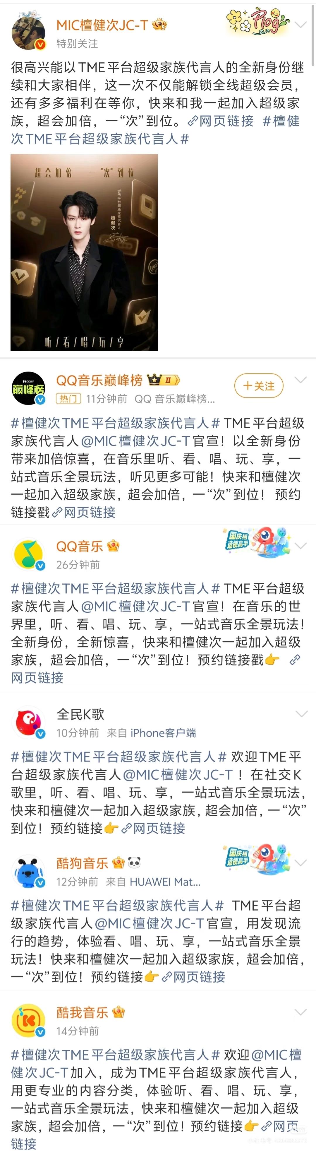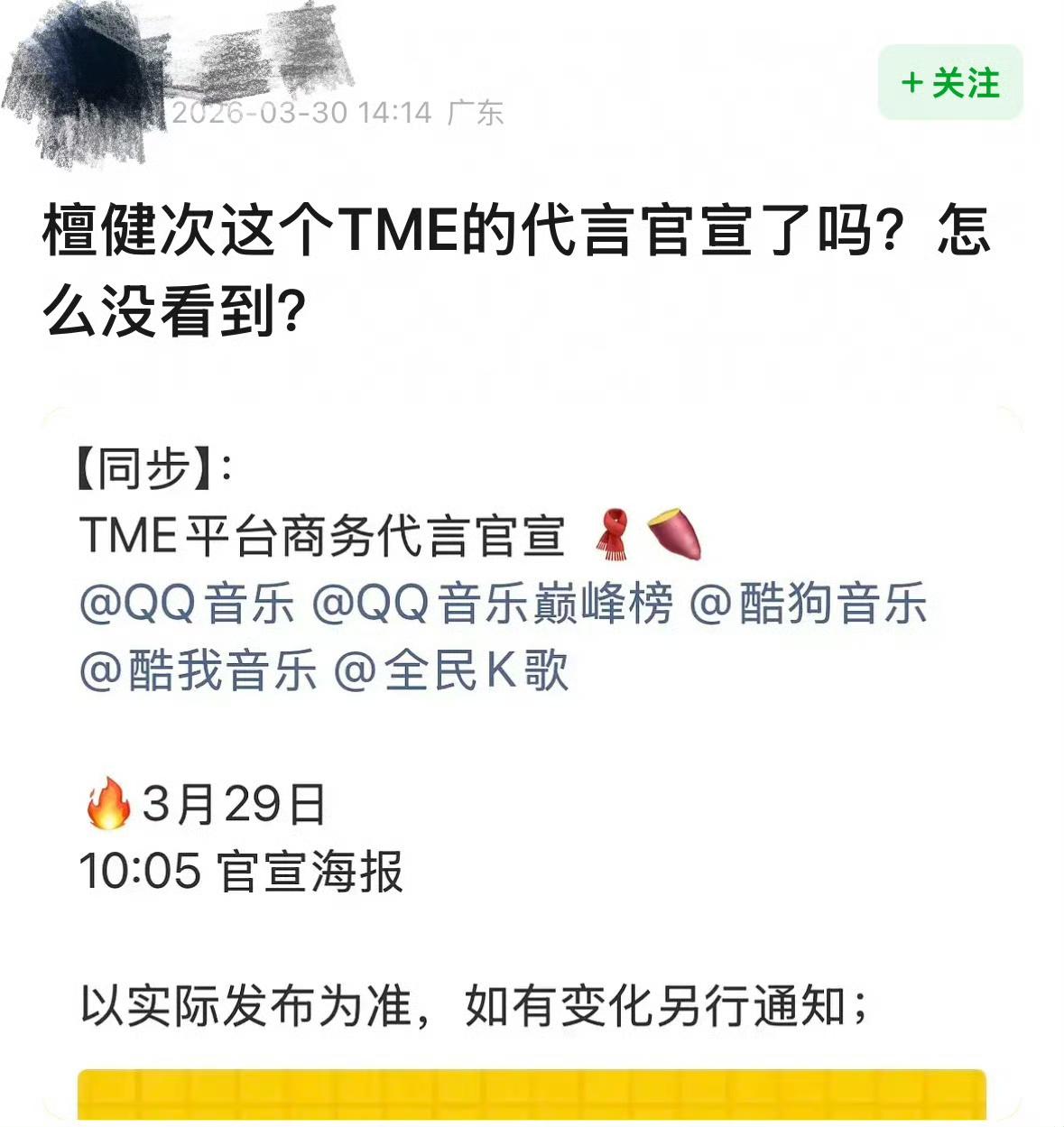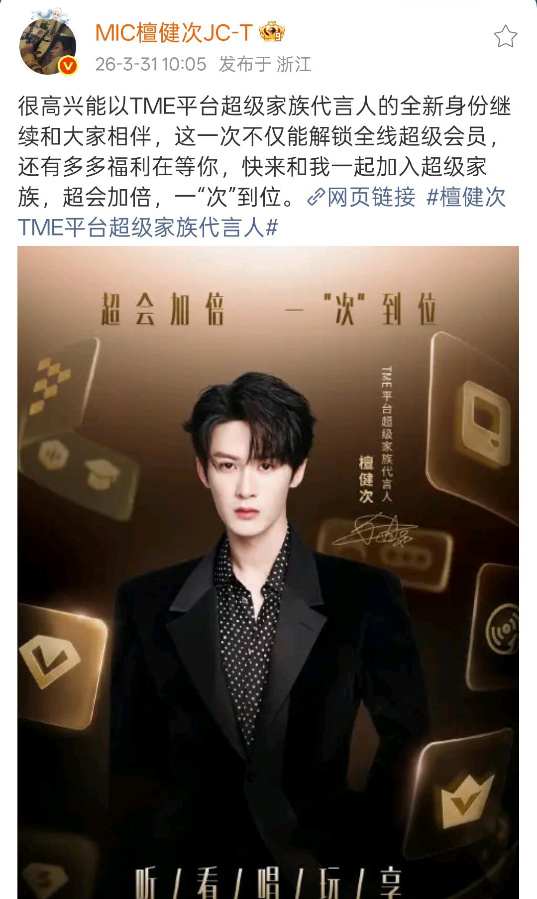 就在刚刚,3月31日10:05,QQ音乐、酷狗音乐、酷我音乐、全民K歌,四大平台共同官宣檀健次成为腾讯音乐娱乐集团TME首位"超级家族代言人"! TME是国内音乐平台的绝对龙头,之前从来没给过“集团代言人”这个title。檀健次是TME成立十年来首位集团级全平台代言人,合作范围涵盖QQ音乐、酷狗音乐、酷我音乐、全民K歌四大国民级应用。 第一个 = 开创者 + 标杆,相当于音乐平台领域的最高认可,此前TME从未设立集团代言人! 所以【檀健次作为TME首位代言人】的含金量极高,是全球范围内音乐平台领域的顶级商务资源,其价值远超单一音乐App代言,核心体现在平台量级、资源整合、商业转化、行业地位四大维度。 檀健次作为TME首位代言人,是艺人音乐领域商业价值的顶级认证不仅仅是 “平台代言人” 更是 “平台共塑者”,音乐领域地位与国民度的双重跃升! 在流量明星扎堆的当下,能拿到平台级代言的,才是真正被市场认证的“硬通货”——檀健次,就是这张硬通货本身! 过了五十年后我的孙女问我,奶奶你的Q音会员怎么还没到期啊,我说因为你爷爷是族长… 期待檀健次今后的音乐事业蒸蒸日上!一路长虹,辉煌无限!