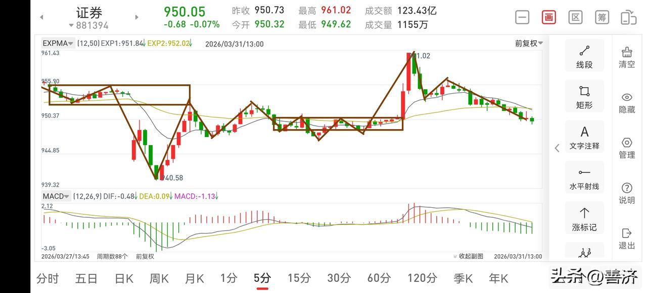 聊聊证券板块(2026.3.31) 今天证券板块早盘冲高回落,符合预期走势,总体就是一个向上抬升的过程,走势无忧,操作上耐心持股待涨即可。 1.从30分钟图一上看,目前围绕30分钟中枢做上下底部震荡,并逐渐向上抬升,目前已经来到了第10笔的回踩,待第10笔完成后,要么继续向上一步一步抬升,要么就是大阳线拉起,不管走哪种走势,都是一个向上的过程,所以走势是无忧的。 2.从5分钟图二上看,在上午构建5分钟三买后没创新高便形成了5分钟的二卖,然后回落至下方中枢区间,构成了一个5分钟的扩展,下午有望继续震荡上行,并逐步完成日线一笔的反弹,所以向上突破是可以期待的。 总之,反转序幕已经拉开,如有重大风险我也会做出友情提醒。