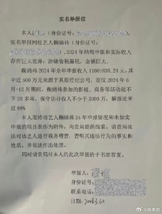 鞠婧祎被实名举报偷税漏税 内娱这热搜是按天排雷吗现在直接炸税务大瓜合约纠纷闹到税务举报,坐等官方核查结果