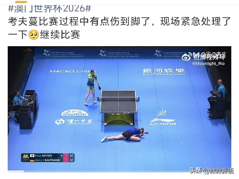 考夫蔓因伤退赛了,看来脚伤的挺厉害。 本来今天是覃予萱对考夫蔓,刚刚看到考夫蔓因伤退赛,这样覃予萱、早田希娜各是一胜,明天覃予萱和早田希娜的比赛,她俩谁能赢谁就可以从小组赛出线了,覃予萱要加油哦。不过明天才是覃予萱的第一场比赛,要好好准备,比别人少打一场。 昨天考夫蔓因为救球滑倒了,伤到了脚踝,后来早田希娜过来这边的时候,也滑了一下,主办方为就不能给铺点好的地胶。昨晚上莎莎比赛的时候,她上场就先用鞋子蹭了蹭周边的地胶,看看滑不滑,转了一圈后试了一下不滑,运动员们都怕在比赛中受伤,我们也怕他们受伤,希望每一位运动员都健康完赛。 今天国乒一共有四场比赛,下午场就是梁靖崑在世界杯的首秀了,他的场外应该是志强教练,大胖一定要保护好自己,千万不能在受伤了。晚间王楚钦、温瑞博还有两场比赛,都加油!