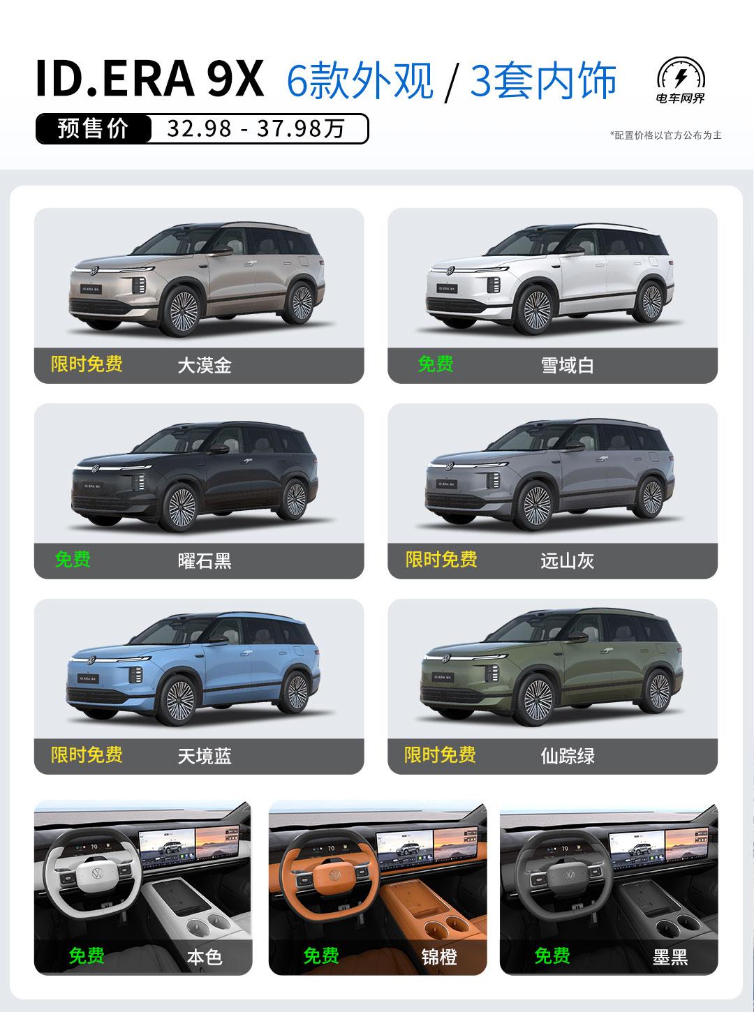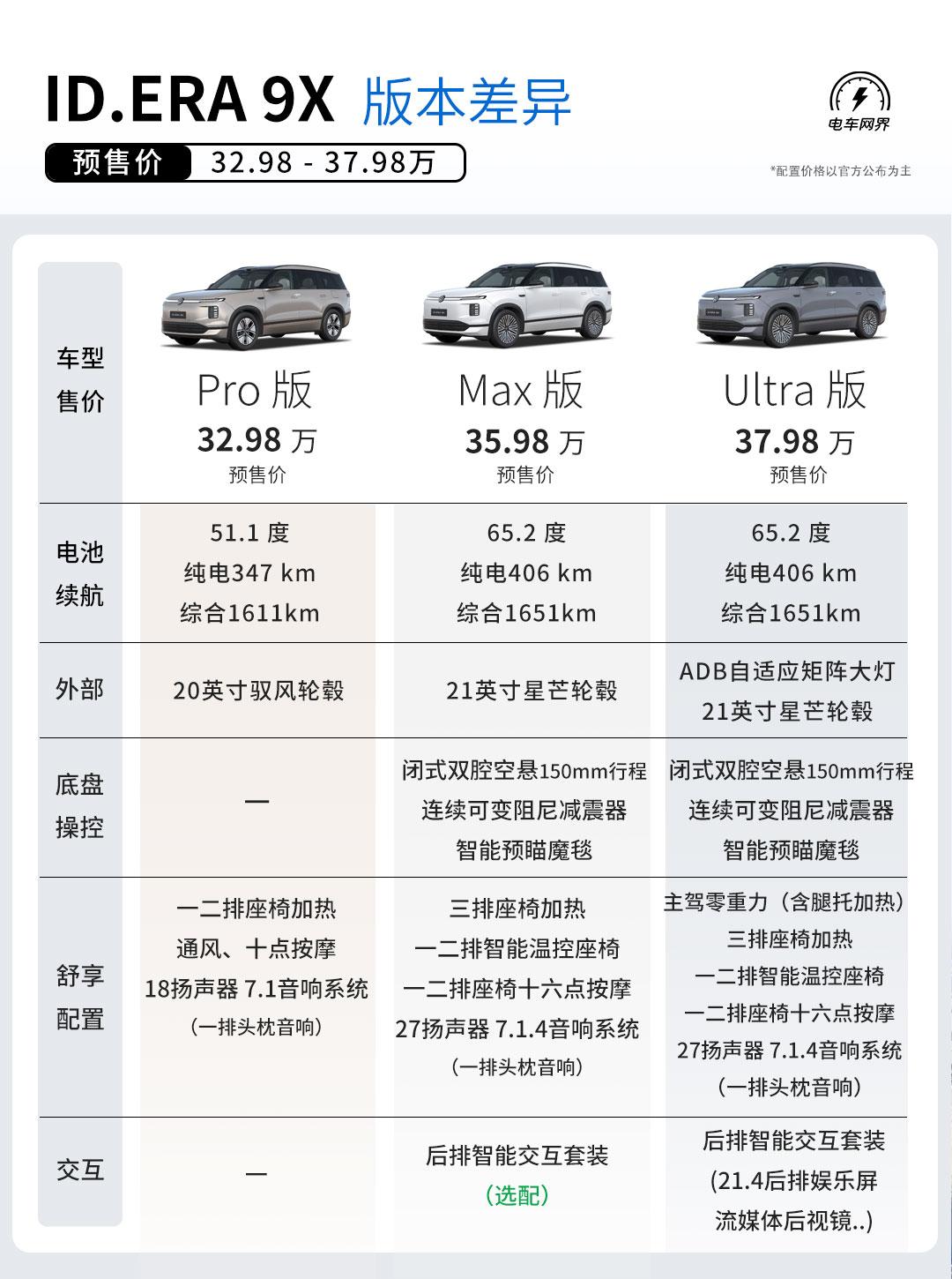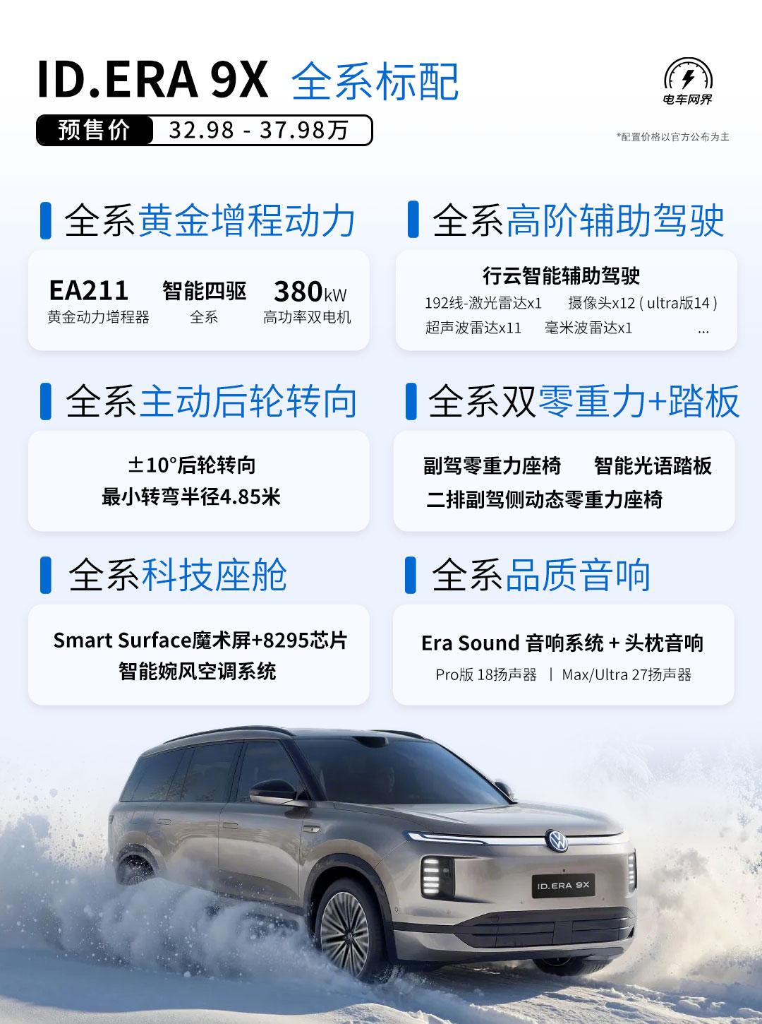 上汽大众ID. ERA 9X预售价出来了,32.98-37.98万。 全系标配挺多的:EA211黄金增程系统、智能四驱,380kw大功率双电机,双零重力座椅、±10°主动后轮转向,激光雷达+行云高阶辅助驾驶等。 Max版和Ultra版还有闭式双腔空悬+DCC连续可变阻尼减震器安排上。 增程的好处就是续航不焦虑,平时纯电行驶安静平顺。 这样一个大6座,结合价格和配置来看,它竞争力怎么样?【来自懂车帝车友圈】