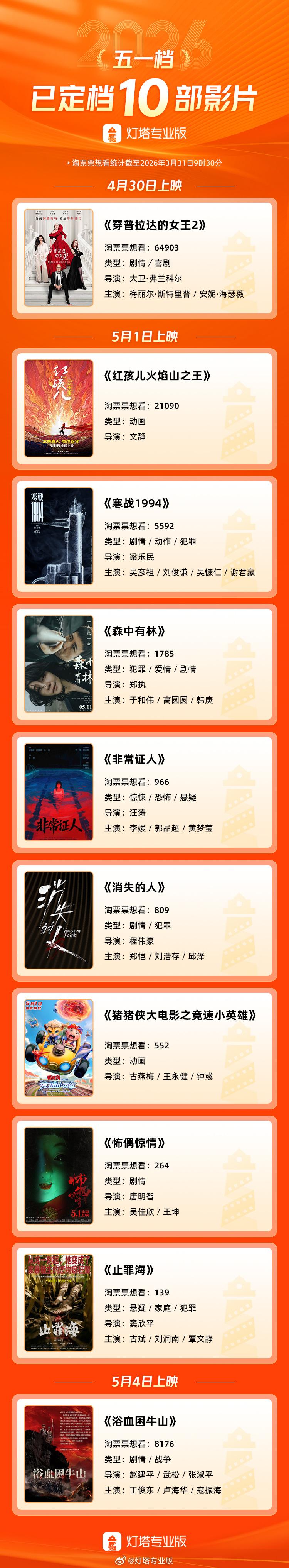 【10部影片定档2026五一档】 春节档已经黄了,五一档还会红吗? 媒体报道,《穿普拉达的女王2》《红孩儿火焰山之王》《寒战1994》等10部电影激战五一档。 书乐想说: 大家为啥不去看电影了? 一来好看的不多。 二来看好的不多。 三来口袋钱不多。