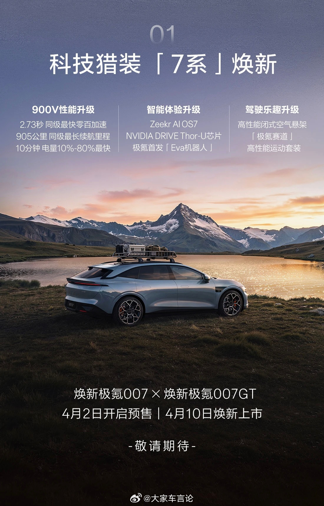 极氪007/007GT 即将迎来焕新版本,900V平台,10分钟电量10%-80%;升级Zeekr Al OS7、NVIDIA DRIVE Thor-U芯片和高性能闭式空气悬架「极氪赛道」高性能运动套装。
