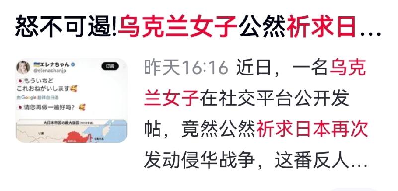 乌女子祈求日本再侵华,极端言论引爆全网:与军国主义为伍,必自食恶果 一乌克兰女子公开发帖祈求日本再次侵华,收获大量点赞转发,极端言论令人愤慨。 历史上乌克兰部分势力曾勾结纳粹犯下暴行,如今极端思想再度死灰复燃。 乌驻日大使曾参拜靖国神社为战犯招魂,与该言论一脉相承。为换取日方援助,不惜践踏中国人民历史伤痛,背弃历史正义。 乌克兰深陷战火,民众本应渴望和平,却在当局纵容下被极端思潮裹挟,一边指望中国援助,一边肆意伤害中国人民感情。 与纳粹、军国主义同流合污,终将自食苦果。漠视历史、挑衅正义,注定被时代和人民唾弃。 对此,大家有何看法?欢迎各位读者来评论区讨论留下你的认知度! 对此,你怎么看? 乌克兰极端言论 铭记历史 反对军国主义