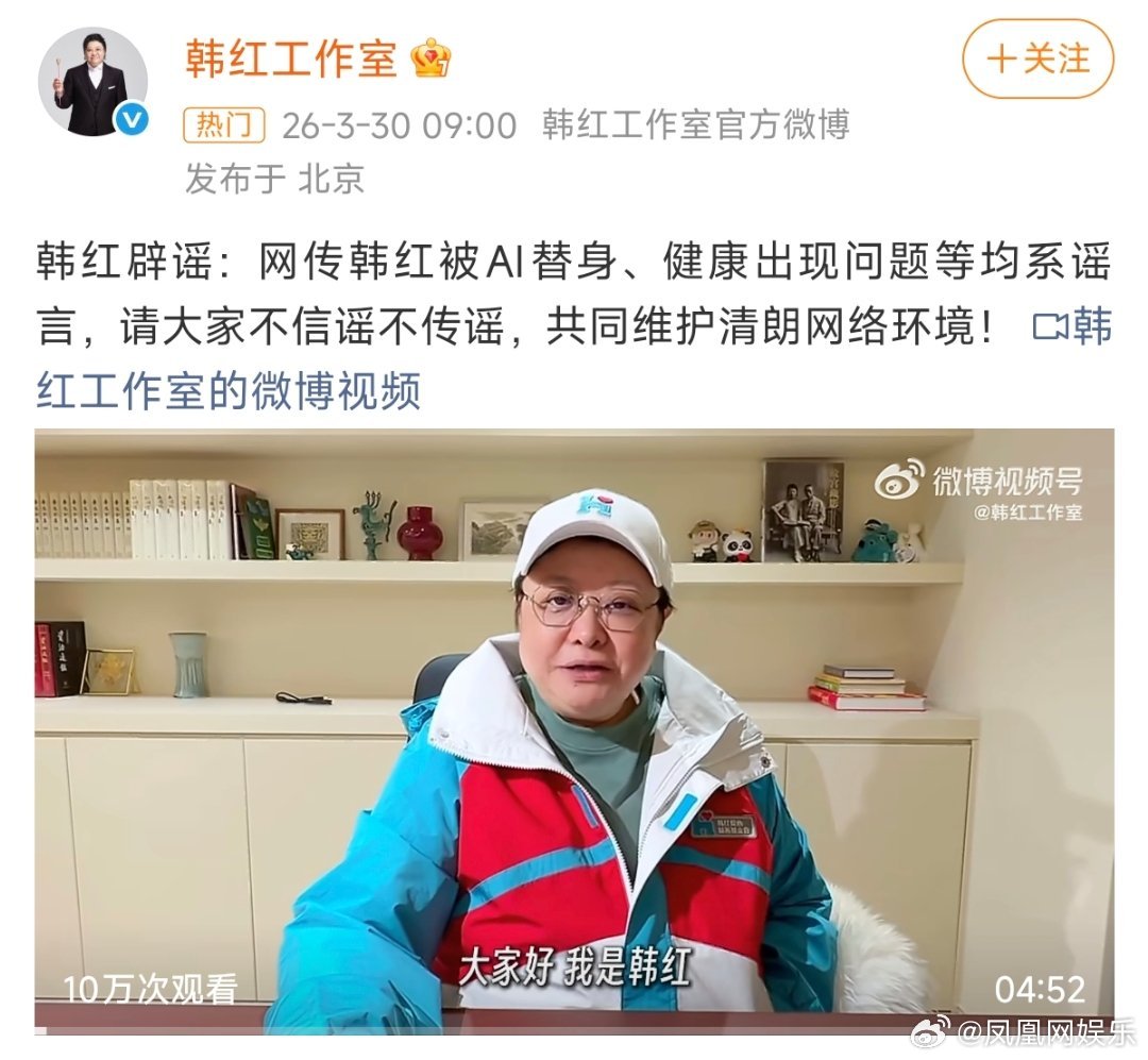 韩红方辟谣被AI替身3月30日,韩红工作室官方账号发文回应网传韩红被AI替身等传言:“网传韩红被AI替身、健康出现问题等均系谣言,请大家不信谣不传谣,共同维护清朗网络环境!”同时发布一条本人出镜的视频,视频中韩红表示:“老韩特别好,很健康,会坚持做公益做到底。让我们把所有的关注度,都放在爱的身上。 ”