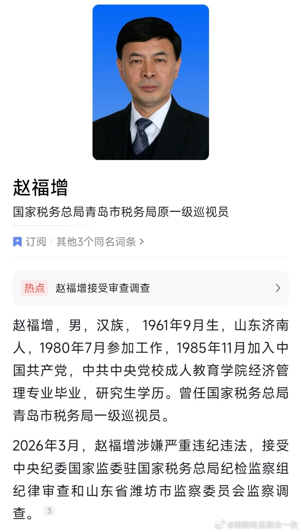 国家税务总局青岛市税务局原一级巡视员赵福增被查。