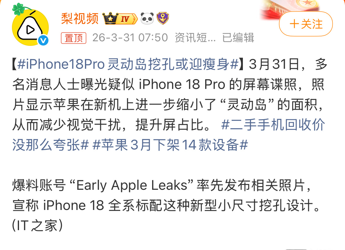 iPhone18Pro灵动岛挖孔或迎瘦身说实话,提升的那一点屏占比,感知真不大。拿点大招出来吧。