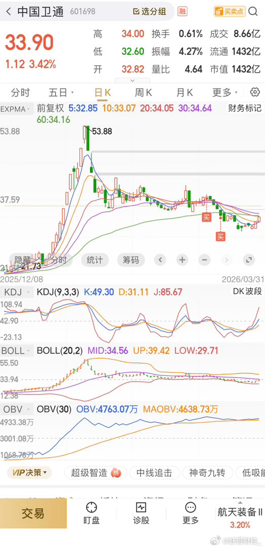 这里再提示一下卫通,我还是那句话,一股不卖,不达目的中国卫通 sh601698[股票]