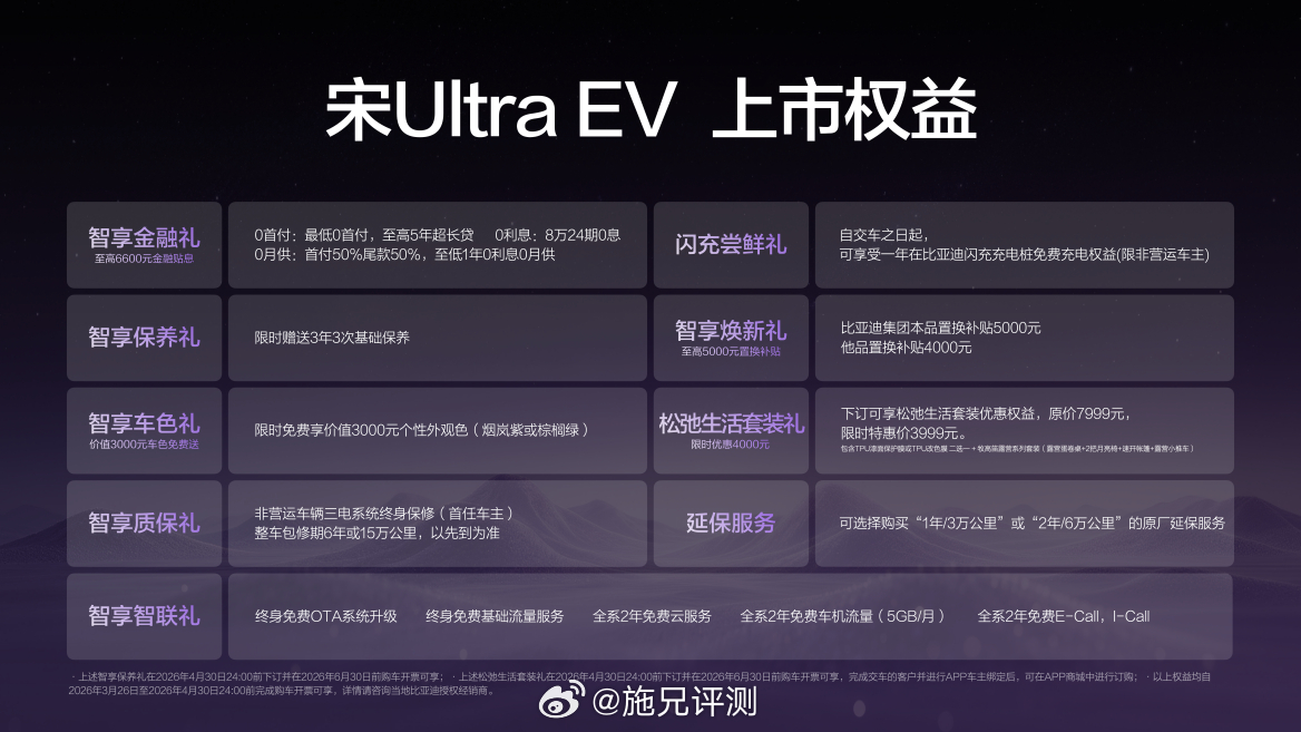 新车全系搭载比亚迪第二代刀片电池及闪充技术,同时拥有710公里CLTC纯电续航、天神之眼B、云辇-C、TBC高速爆胎稳行系统等豪华配置,为消费者带来全新的纯电出行方式,颠覆技术打造越级体验,全面开启闪充时代。比亚迪王朝正在构建一个从购车、用车、到养车的全链路无忧体系。为此,宋Ultra EV带来了“0元购、0元用、0元养”的超重磅购车权益!同时还有其他丰富权益,为用户带来超值购车体验。宋Ultra EV 搭载第二代刀片电池、闪充技术及激光雷达三大行业颠覆性技术。新车搭载的闪充技术带来出行新体验。常温下,5分钟电量告急秒“回血”,喝杯咖啡、刷会视频就能继续出发;9分钟从10%充到97%,节假日出行无需久留服务区。零下30℃也仅多3分钟。充电如加油,告别久等焦虑与规划,畅享纯电出行松弛感。 不仅如此,比亚迪闪充桩的“闪充蓝”外观辨识度极高,成为充电站的独特风景。其功率达1500千瓦,充电速度远超同行,大幅节省时间成本。全球首创“滑轨悬吊式T型桩”,充电枪“轻而易举”,女生也能单手提起;充电线“干净整洁”,充电更加优雅从容。无感支付设计,可实现“即插即充,无感支付”。此外,全面应用的液冷技术,保障高温下稳定满功率输出,打造极致闪充体验。值得一提的是,如此快的充电速度并不会对电池造成伤害。第二代刀片电池历经“500次闪充循环后,边闪充、边针刺”等严苛实验,安全耐用。不仅如此,电池质保权益全面升级,容量低于77.5%免费包换,电芯终身保修,让用户彻底消除后顾之忧,尽情享受纯电出行的便捷与安心。宋Ultra EV可选装天神之眼B-辅助驾驶激光版(DiPilot 300),可以全方位感知复杂路况,即使在复杂路况下也能“耳聪目明”。天神之眼 5.0搭载最新大模型版本,在全闭环端到端的基础上,新增强化学习能力,打造行业领先的辅助驾驶体验。在领先的硬件和软件的协同赋能下,轻松实现路口自主过红绿灯、窄路从容调头、停车场稳稳泊车,还能应对极窄场景、复杂掉头,城区拥堵主动切换辅路,新手也能如老司机般从容出行。“三大越级”配置,全家出游尽享松弛感纯电出行常因续航问题让人望而却步,宋Ultra EV基于第二代刀片电池技术,拥有710km超长纯电续航。早上从上海满电出发,无需充电,傍晚就可以到武汉户部巷吃宵夜了,还能去东湖看樱花,在江滩漫步。动力方面,宋Ultra EV搭载最大270千瓦大功率电机,百公里加速快至6.8秒,日常通勤超车利落,周末进山推背感十足,能轻松甩掉“班味”,且最高时速可达210km/h,高速行驶动力充沛。空间方面,宋Ultra EV以2840mm轴距打造标准B级SUV大气格局,后排腿部空间达986mm,远超德系中大型豪华SUV。730L后备箱轻松容纳6个20寸行李箱加1个婴儿车,150L前备箱独立分区收纳。主驾、副驾座椅可同步放倒秒变“大床”,搭配能冷热调节的智能冷暖箱,让全家出行尽享松弛与惬意。3C神装护体,拥有畅爽驾控松弛感宋Ultra EV不仅有续航、动力、轴距“三大越级”配置,还拥有云辇-C、TBC等3C神装。新车全系标配云辇-C智能阻尼车身控制系统,毫秒级无级自适应调节,搭配前双球头麦弗逊后五连杆独立悬架,精准抑制车身侧倾,在高速过弯等场景下带来稳定且精准的操控体验,尽享极致驾控乐趣。更值得一提的是,同级领先的TBC高速爆胎稳行系统,能在最高140km/h时速下爆胎瞬间介入,稳住车辆,新手也能轻松应对突发状况。同时配备云辇预瞄功能,配合智能防晕车系统,让全家出行更加安心惬意,全方位守护每一次旅程。全方位安全守护,情绪价值拉满,带来全家安心松弛感宋Ultra EV 在安全方面也毫不妥协。车身以高达77%的超高强度钢打造,坚如磐石;全车配备7个安全气囊,包含同级少有的前排远端安全气囊,形成全方位保护屏障。更有实用的哨兵模式,以及全系标配的五视角行车记录仪,多维度守护,让消费者出行安全无忧。同时,宋Ultra EV堪称情绪价值“制造机”。一键远程备车,提前开启空调、座椅通风加热,四季皆享舒适;车机远程餐厅排号,美味无需苦等。轻敲前备箱解锁,便利又有趣。多功能扩展接口超实用,装手机支架、运动相机,车内Vlog轻松拍。魔方传声筒传递温暖叮嘱,互动感满满。小憩模式伴助眠白噪声,惬意放松。16扬迪声音响系统,打造音乐厅级听觉盛宴,全方位满足需求,出行自在又畅快。宋Ultra EV全系标配超100项实用配置,包括第二代刀片电池及闪充技术、主副驾座椅记忆、带遮阳帘的全景天幕、电动后尾门、15.6寸大屏、前备箱电动解锁、前排远端气囊、螺纹接口等,入门即满配,绝对是2026年最值得入手的SUV。宋Ultra EV的上市,开启B级SUV闪充时代。新车以闪充技术为核心,在驾控、续航、空间、智能等方面全面越级领先,成为B级纯电SUV价值新标杆。再搭配诚意满满的购车权益,必将成为市场爆款,引领消费者开启便捷、舒适、安全的纯电出行时代。