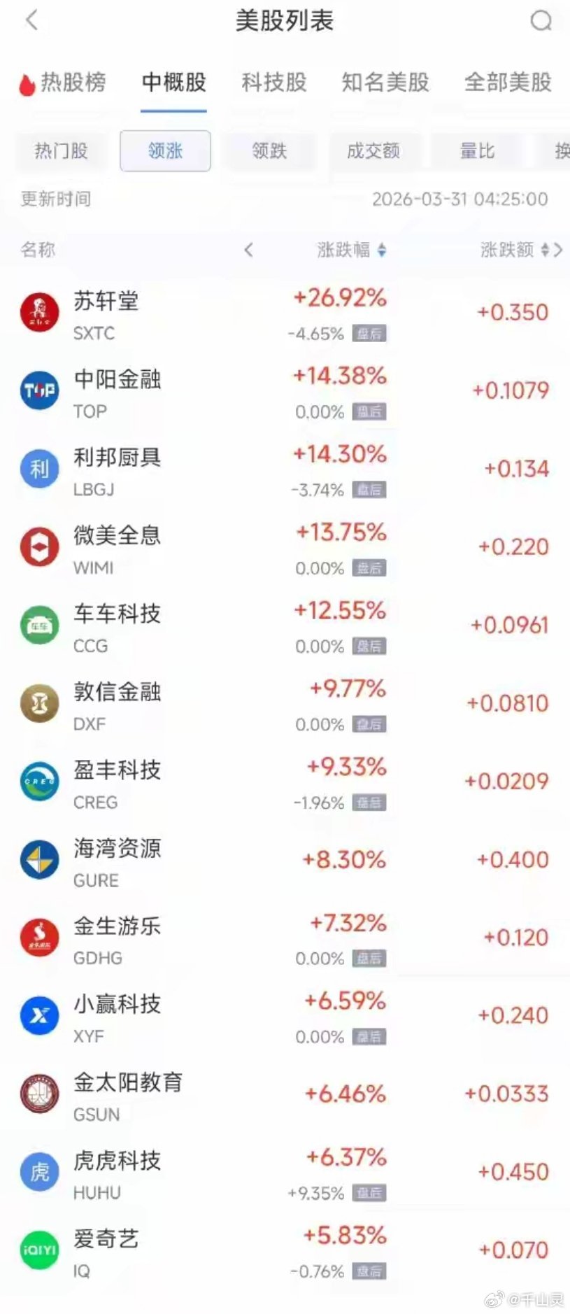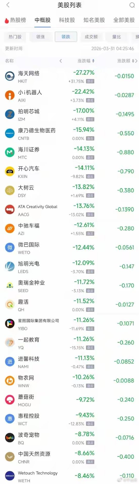 3月31日热门中概股多数下跌,纳斯达克中国金龙指数(HXC)收跌0.36%。