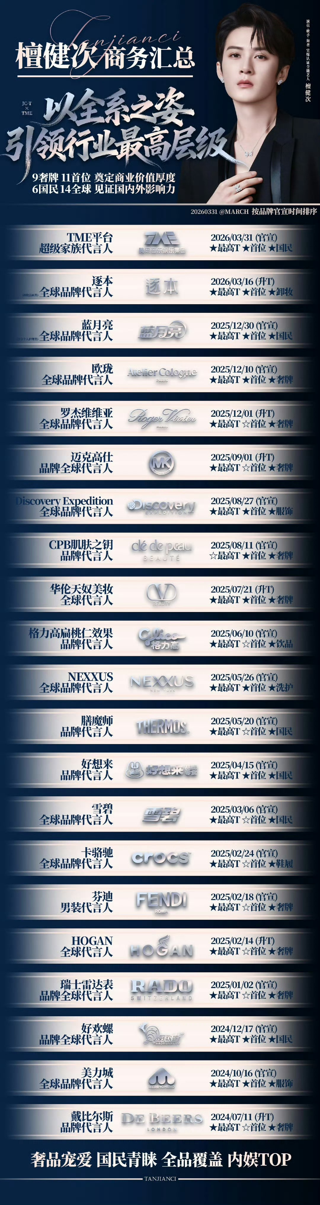 恭喜檀健次代言+1,版图继续扩张,看到网友发的檀健次代言目录,太多、太顶,千言万语汇成一句,檀健次值得,他本就是唯一!