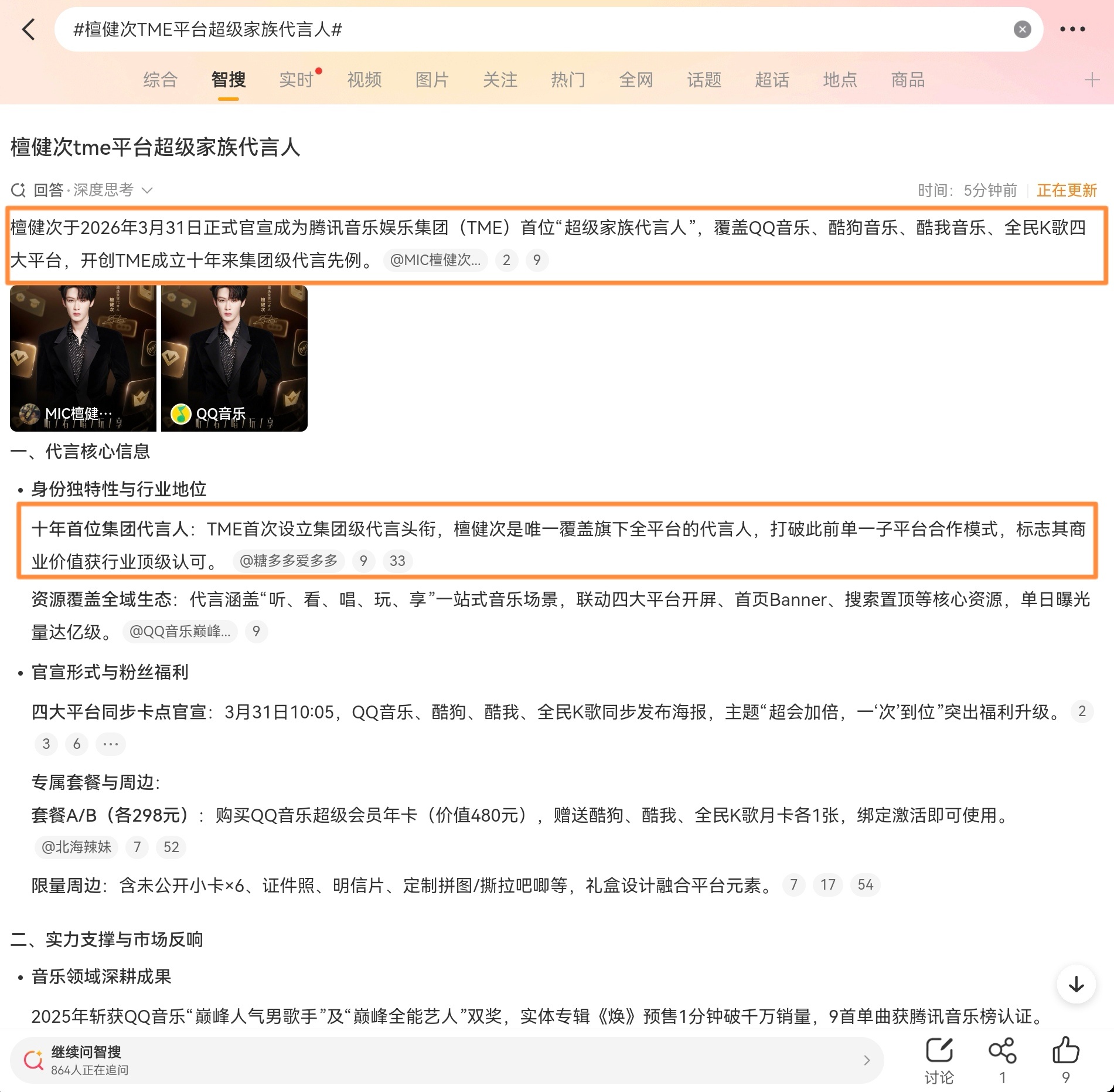 因为不了解TME,就去智搜瞅了瞅,满眼都是“首位”“十年首位”“唯一”...这样的限定词,这些词语在不同侧面,诉说着檀健次的史无前例和唯一,而“唯一”,与檀健次实在有着天然的贴合,这与他一直追求的不可替代,完配!