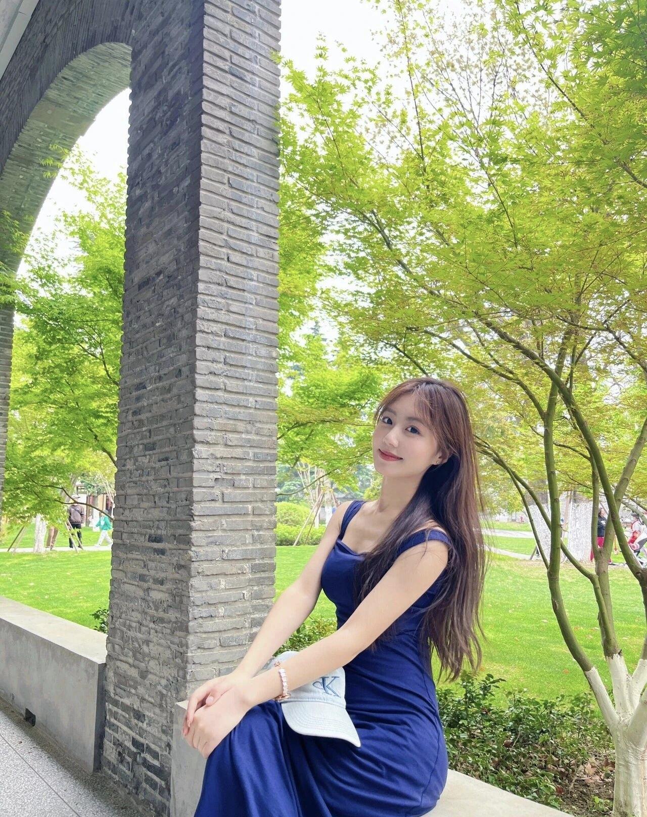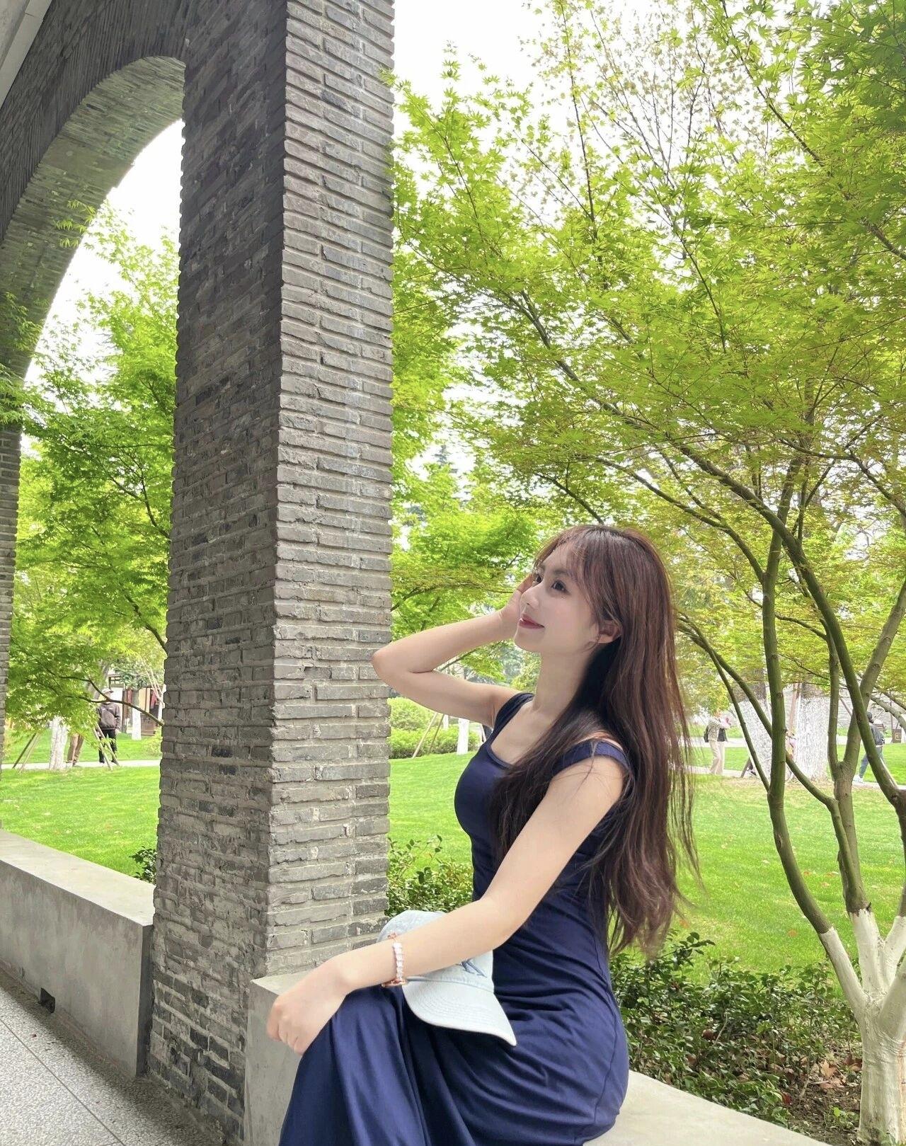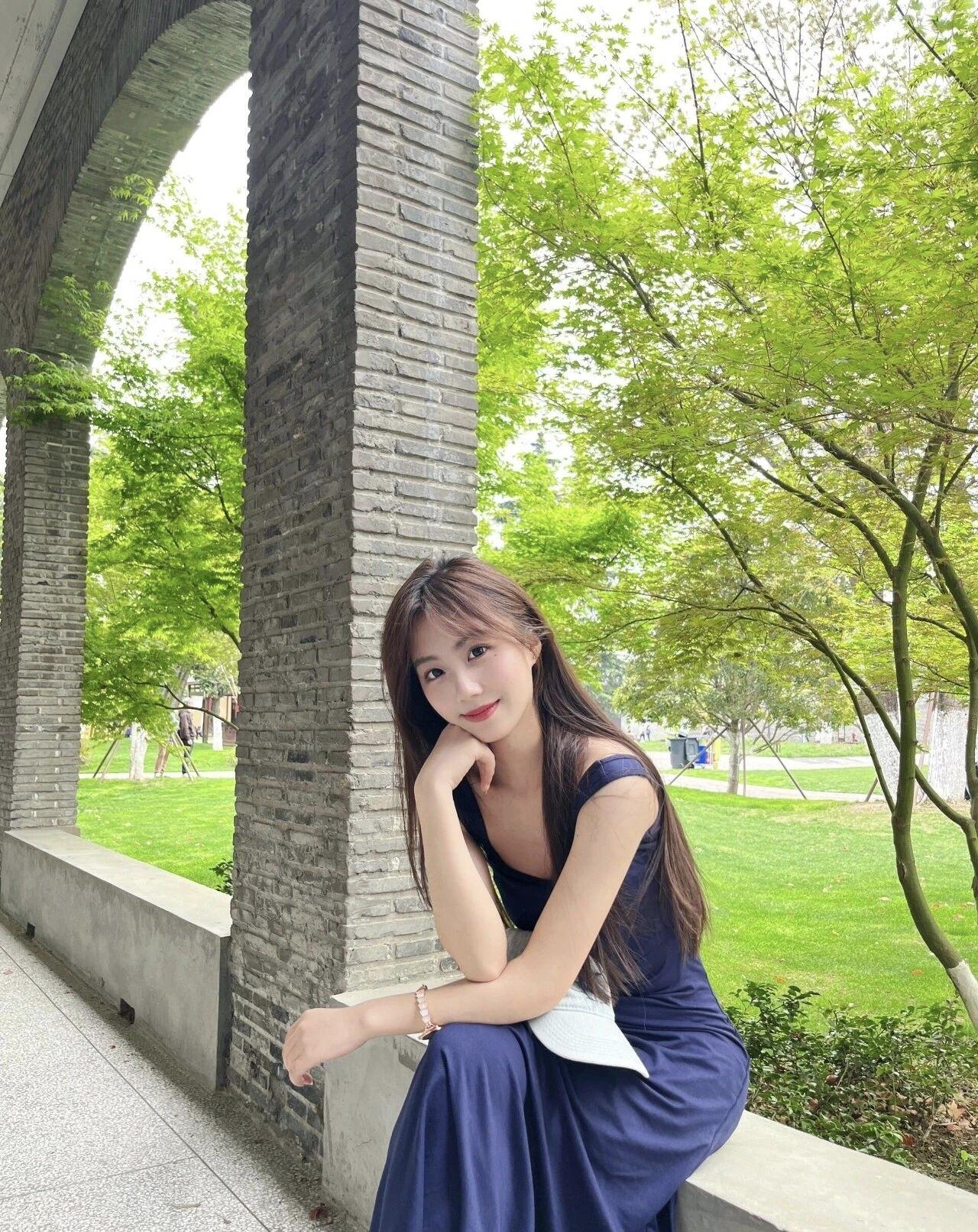 优雅蓝裙少女,静坐绿荫长廊,享受宁静时光。