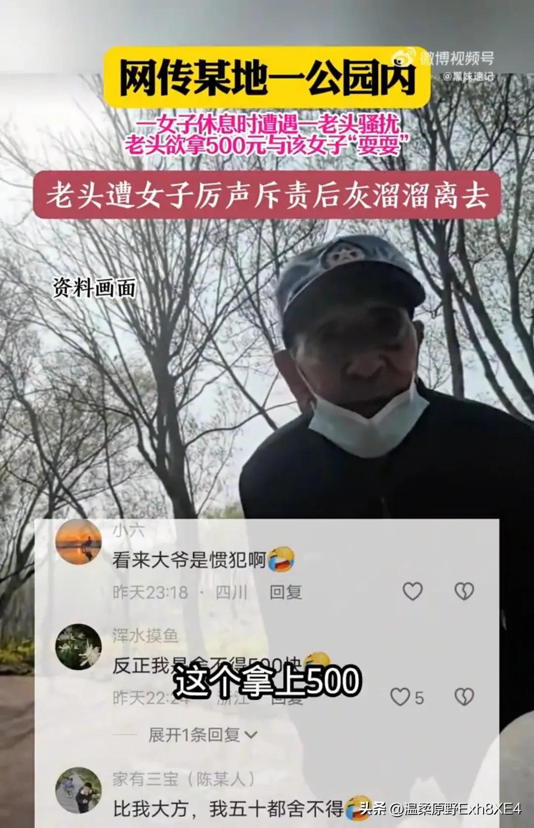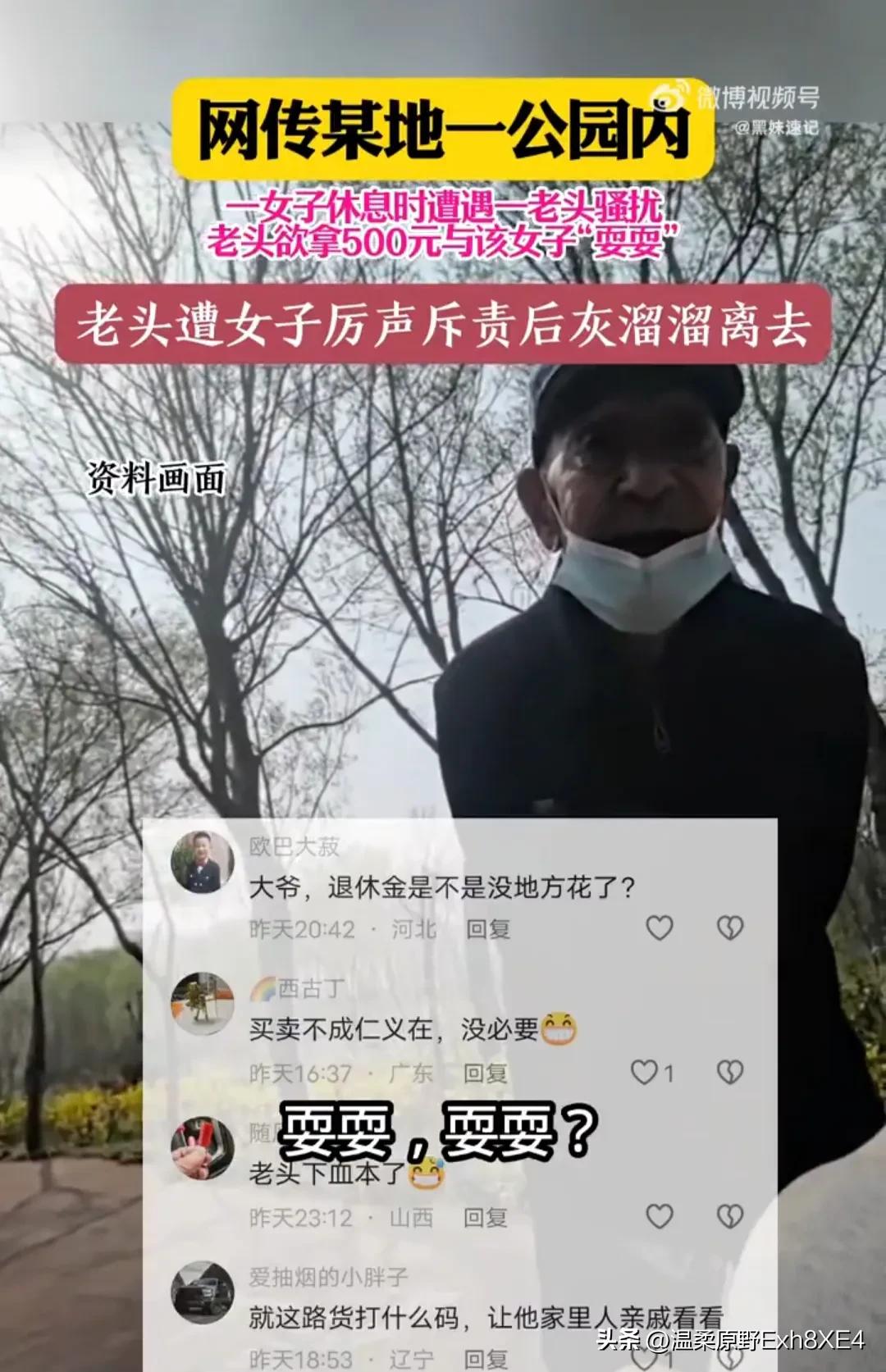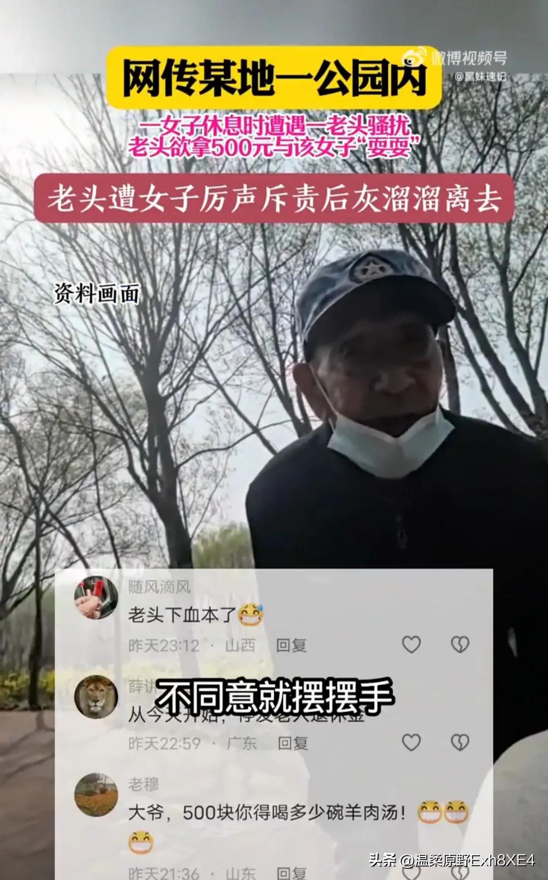“还是退休金太多了!”公园里,女子安安静静坐在椅子上休息,突然过来一个陌生大爷畏畏缩缩打招呼,女子吓了一跳,问他干啥, 大爷竟脱口而出“拿上个500耍一下,你同意点点头,不同意就摆摆手。” 女子听清后,气得呵斥大爷滚远点,并好心告知“前边右转有个河跳下去(不花钱还去火)” 有网友说,为老不尊,不是所有老人都需要尊重!这种退休金停了就老实了! 还有网友说,不用那么麻烦,给他2个耳光子。公园里孩子比较多,希望相关部门都管一下这个事情,别让公园成为藏污纳垢的危险地区。这事不是个例,我也遇到过,大早上的,太踏马恶心人了。 还有网友看热闹不嫌事大说,老头真下血本了,500能喝多少碗羊肉汤?让他给500现金,拿了钱就跑,可行不[狗头]? 有时,自尊自爱真不是年龄决定的。对此,您怎么看?