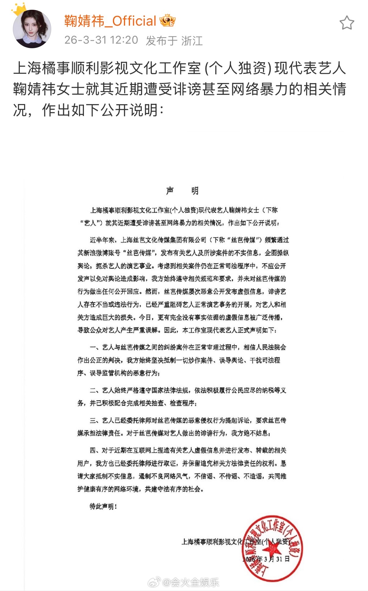 鞠婧祎工作室发布声明回应相关讨论1️⃣艺人与丝芭传媒之间的纠纷案件在正常审理过程中,相信人民法院会作出公正的判决;2️⃣艺人始终严格遵守国家法律法规,依法积极履行公民应尽的纳税等义务,并已积极配合完成相关抽查、检查程序;3️⃣艺人己经委托律师对丝芭传媒的恶意侵权行为提起诉讼;4️⃣对于近期在互联网上捏造有关艺人虛假信息并进行发布、转载的相关用户,也已经委托律师进行取证,并保留追究柜关方法律责任的权利。