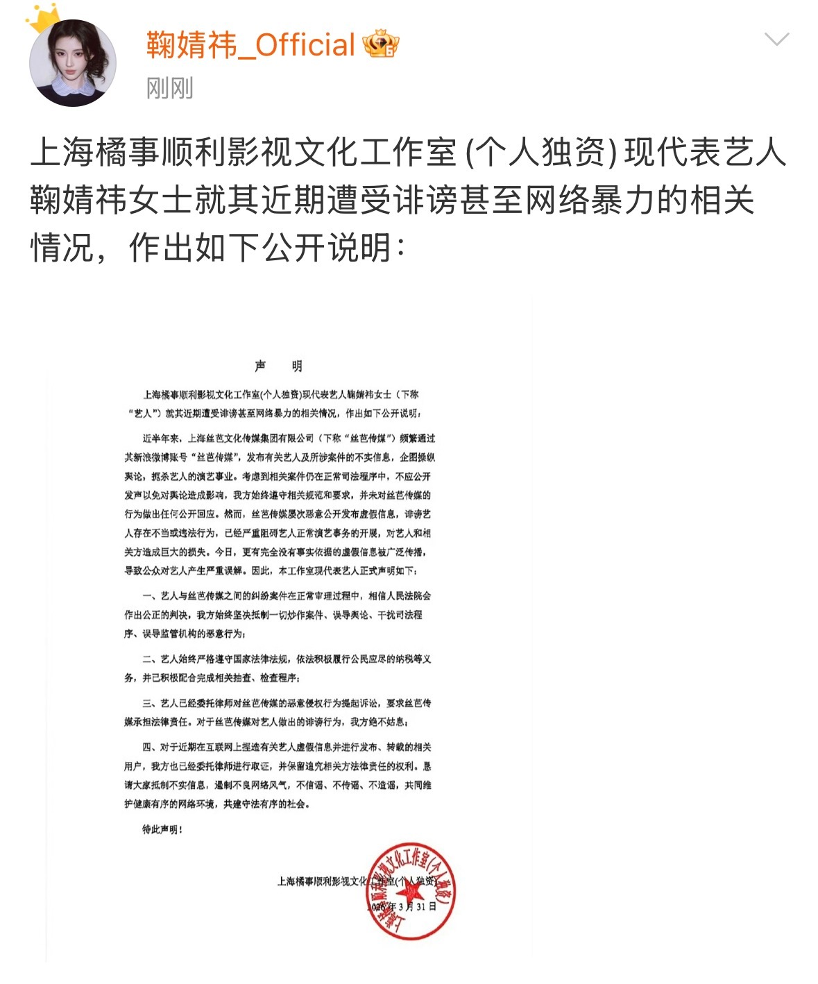鞠婧祎工作室回应鞠婧祎方起诉丝芭 31日,鞠婧祎被实名举报偷税漏税 。随后,鞠婧祎工作室发布声明,称丝芭传媒多次发布不实信息恶意诽谤艺人,严重影响其演艺事业。针对相关争议,工作室表示:艺人与丝芭的纠纷案件正正常审理中;艺人严格遵守法律法规,依法履行纳税义务,已配合完成相关抽查、检查;艺人已委托律师起诉丝芭传媒的侵权行为提起诉讼,同时对造谣传谣用户取证并保留追责权利。