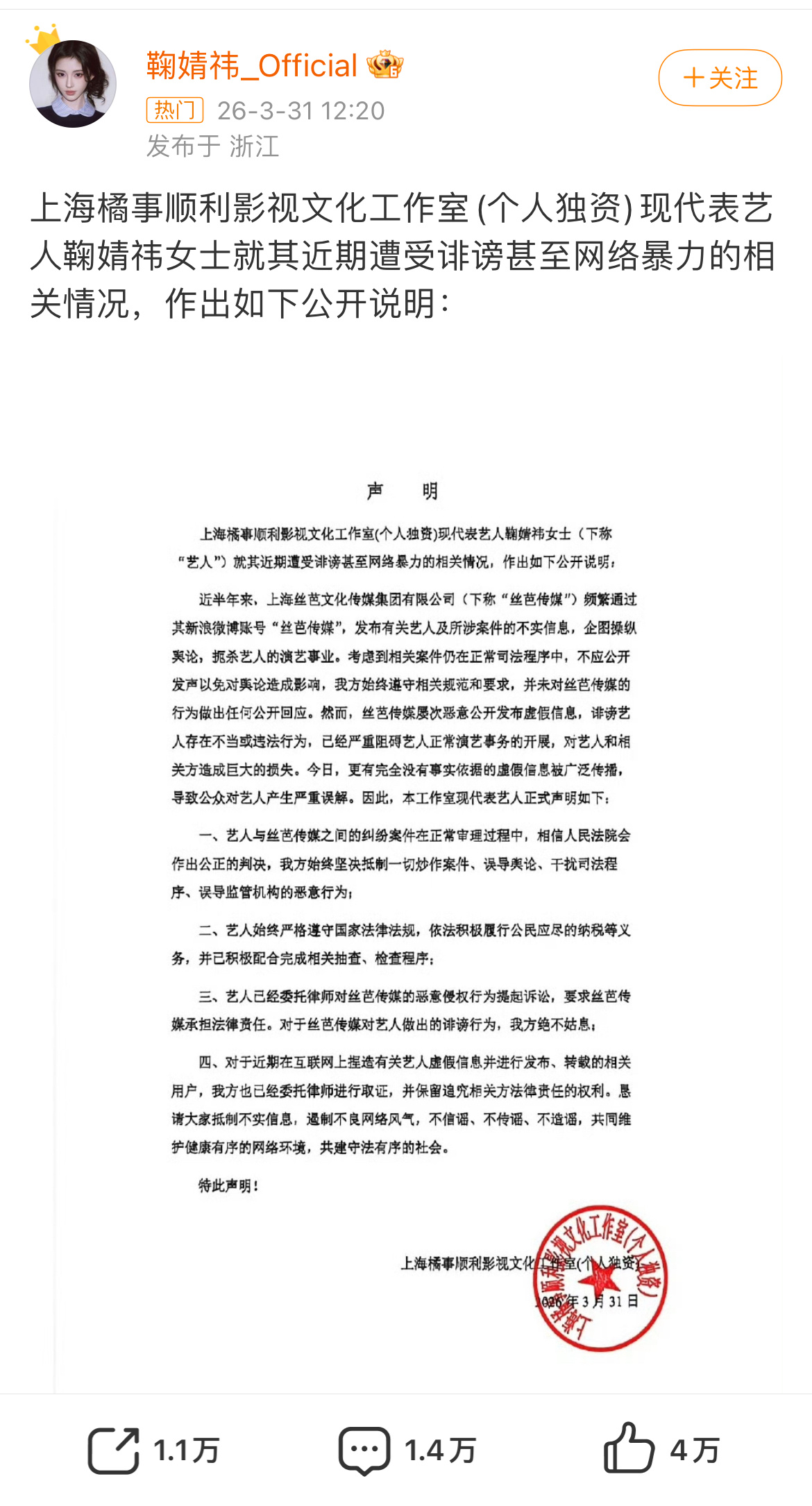 鞠婧祎工作室回应并起诉丝芭第二条回应了税相关,说已经积极配合完成相关抽查、检查程